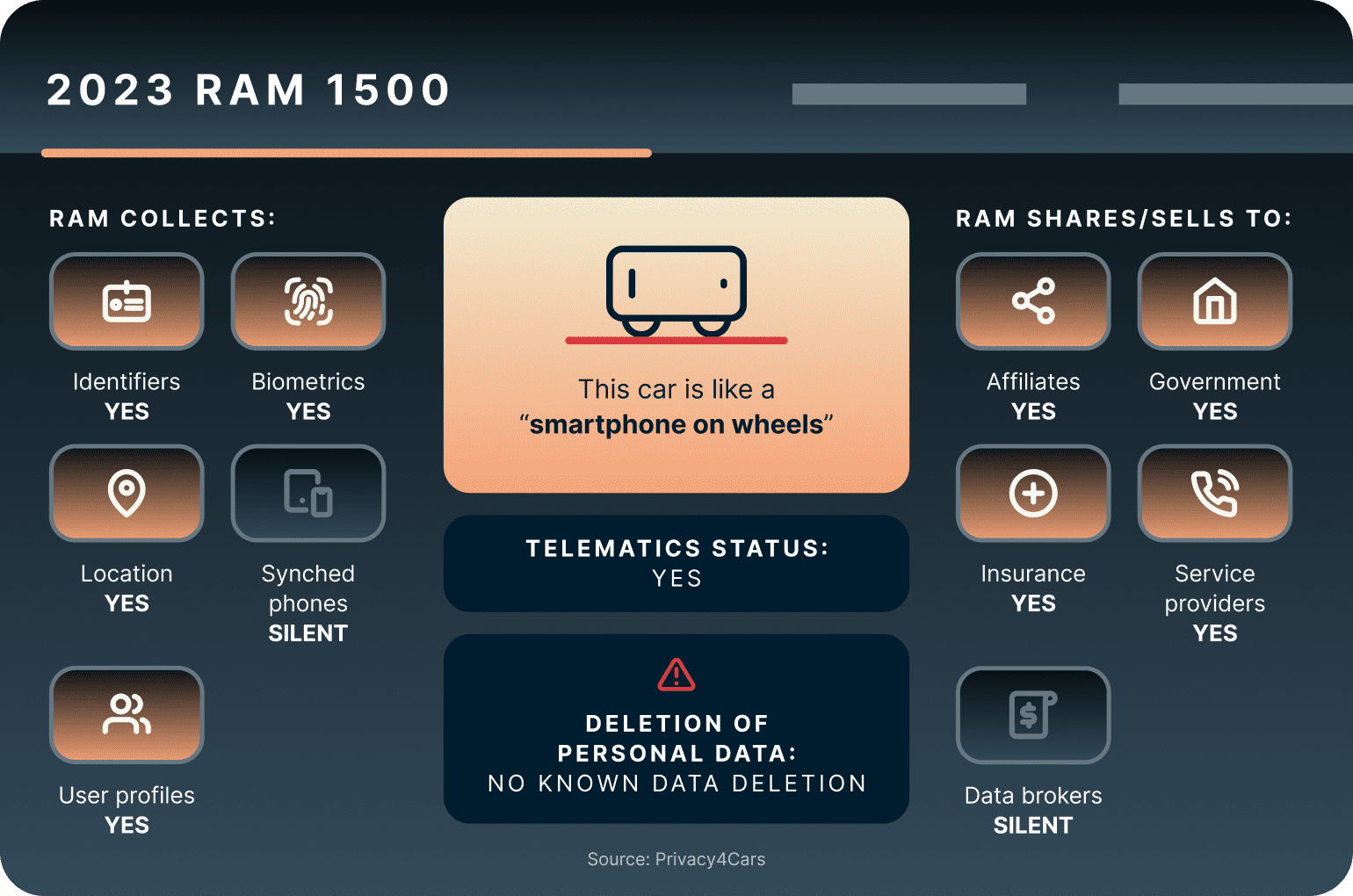 When it comes to personal data, RAM opts for a “no-deletion” policy, including personal identifiers from names and addresses to Social Security numbers and driving license details, as well as biometrics. RAM also monitors driving habits, recording timestamps, speed, acceleration, and braking. The vehicle tracks journey details like location, weather, and routes taken. It even keeps an eye on its own status, monitoring refueling, battery levels, and camera imagery.