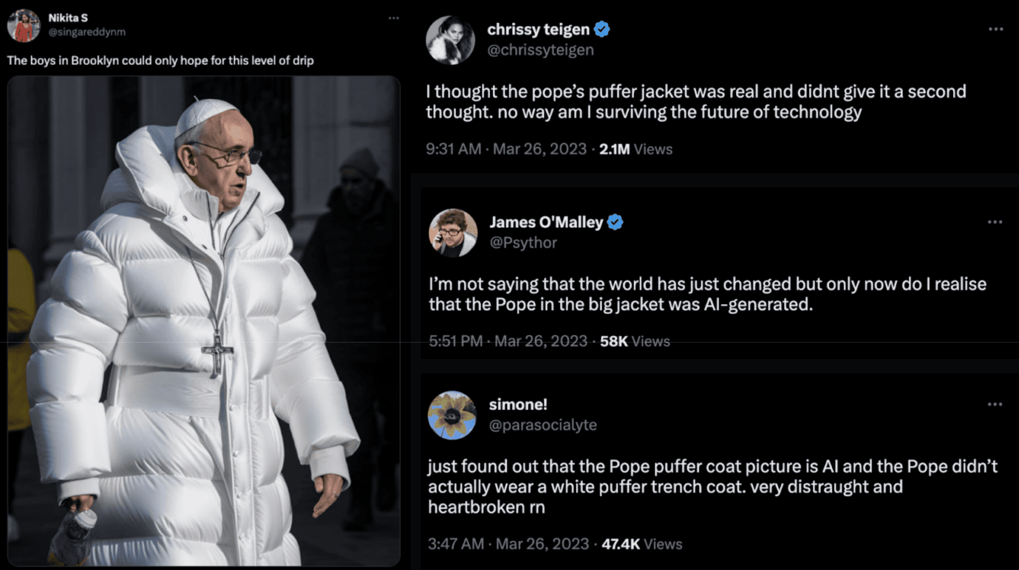 Les technologies de l'IA ont progressé à un point tel qu'il est presque impossible de distinguer les deepfakes d'un contenu authentique sans l'aide d'une analyse experte. Par exemple, vous souvenez-vous de ces fausses photos générées par l'IA représentant le pape François vêtu d'un grand manteau blanc et qui ont trompé beacoup d’internautes l'année dernière ?