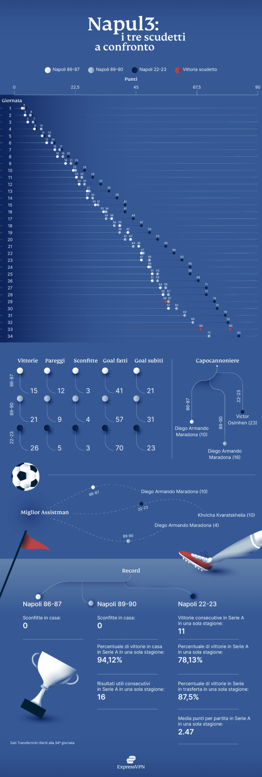29 aprile 1990, un gol di Marco Baroni, allora difensore del Napoli, oggi allenatore del Lecce, regala agli azzurri la vittoria in casa contro la Lazio 1-0, vittoria che sancisce l’aritmetica certezza della conquista del secondo scudetto nella storia del club partenopeo. Dopo 33 lunghi anni, il Napoli è tornato a vincere il titolo e lo ha fatto in maniera travolgente, conquistando il tricolore con cinque giornate di anticipo dalla fine del campionato, eguagliando il record di Torino, Fiorentina, Inter e Juventus. È il primo scudetto post Maradona. Sembrava diventata quasi una maledizione per i tifosi azzurri, come se l'era del Pibe de Oro e dei suoi compagni fosse stata una parentesi luminosa irripetibile. E invece, quello di quest'anno, ha per certi versi superato le gesta compiute dal Napoli di Diego, considerando anche la storica qualificazione ai quarti di Champions League.
