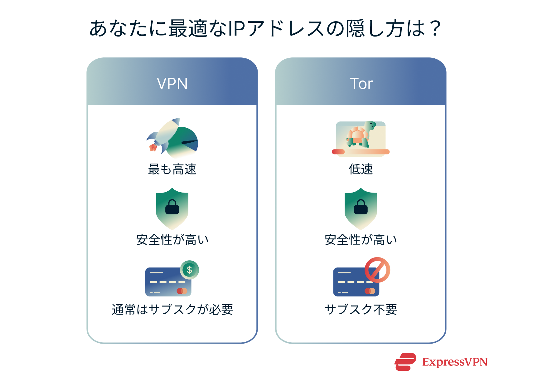 最適なIPアドレスの隠し方はニーズ次第です。一般的にはVPNを使うのがベストチョイスですが、状況によってはTorも検討する価値があります。