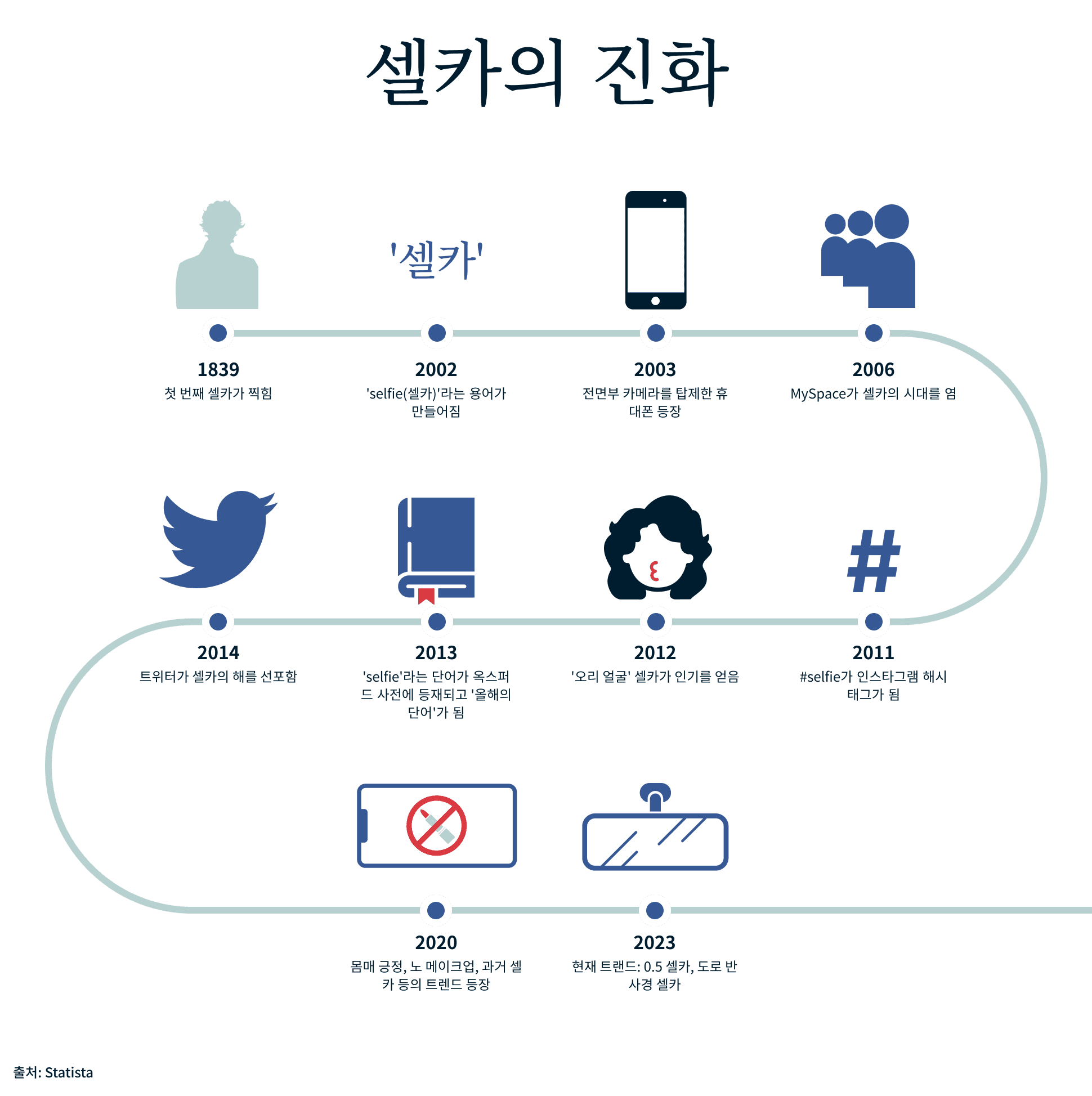 2000년대 초, 휴대전화 기술의 발전과 함께 소셜 미디어 플랫폼이 번창하기 시작했고, 사람들이 개인적인 순간을 공유하고 성장하는 온라인 문화에 기여하는 공간이 탄생했습니다. 이는 우리가 알고 있는 현대 셀카의 탄생을 불러온 촉매이며, 이후 악명 높은 ‘오리 얼굴’ 셀카와 참새 얼굴 셀카, 물고기 표정 셀카 등이 등장했습니다.