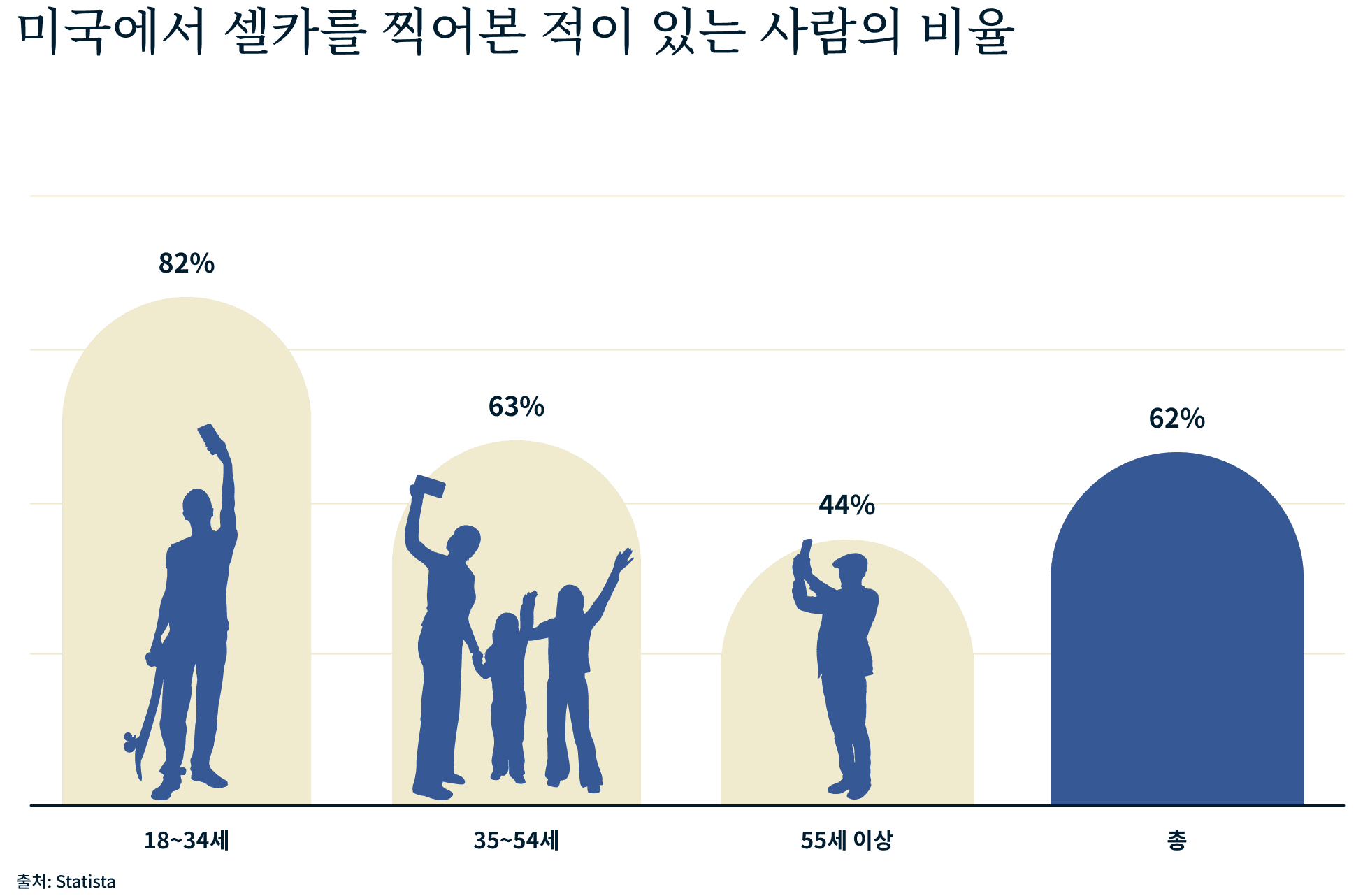 실제로 몇 년 전 통계에 따르면 미국인의 62%가 사는 동안 셀카를 찍은 경험이 있었고, 가장 어린 연령대인 18세에서 34세 중에서 셀카를 찍어본 사람이 82%로 가장 많았습니다.
