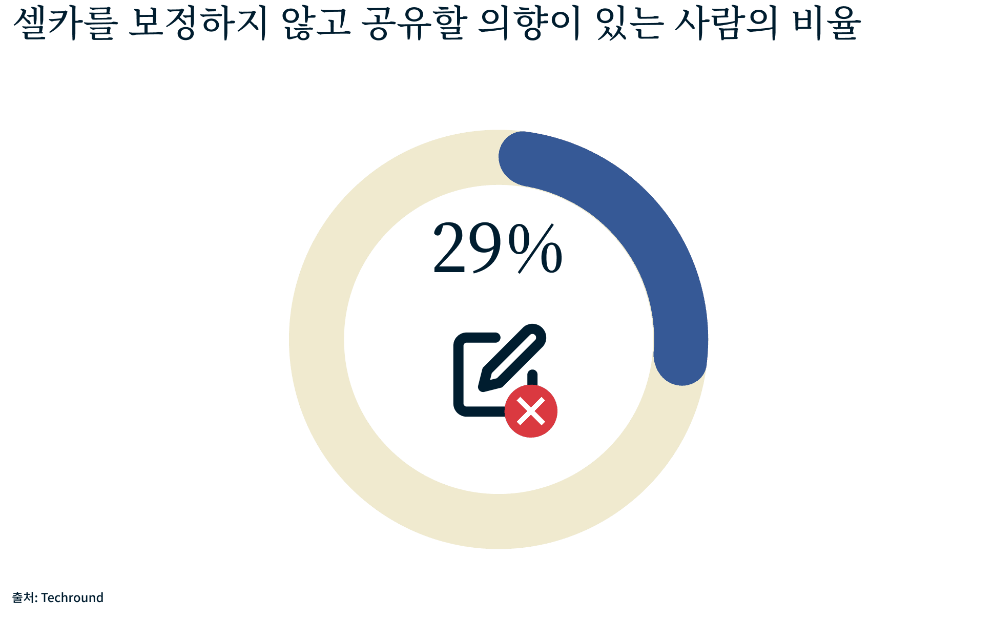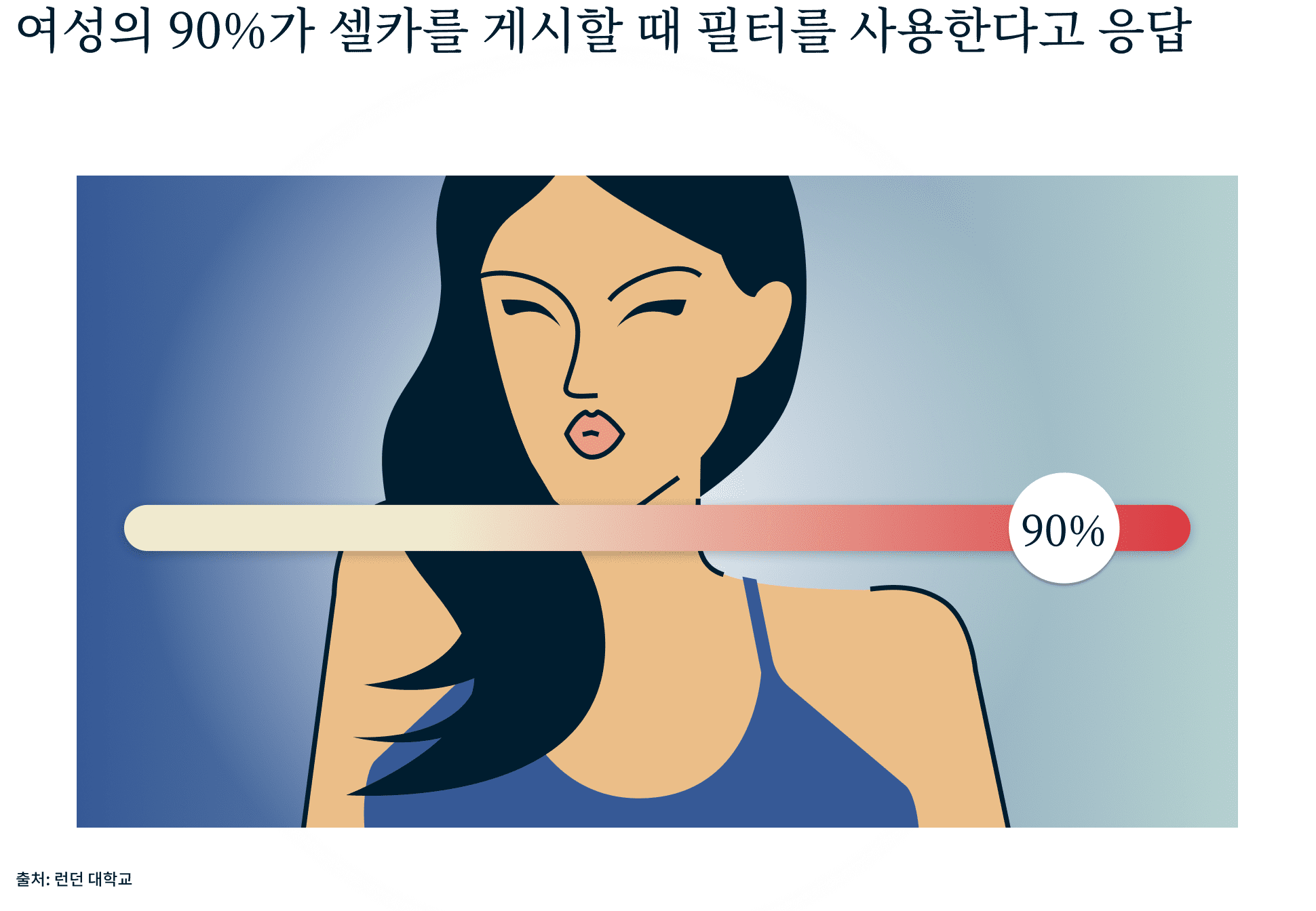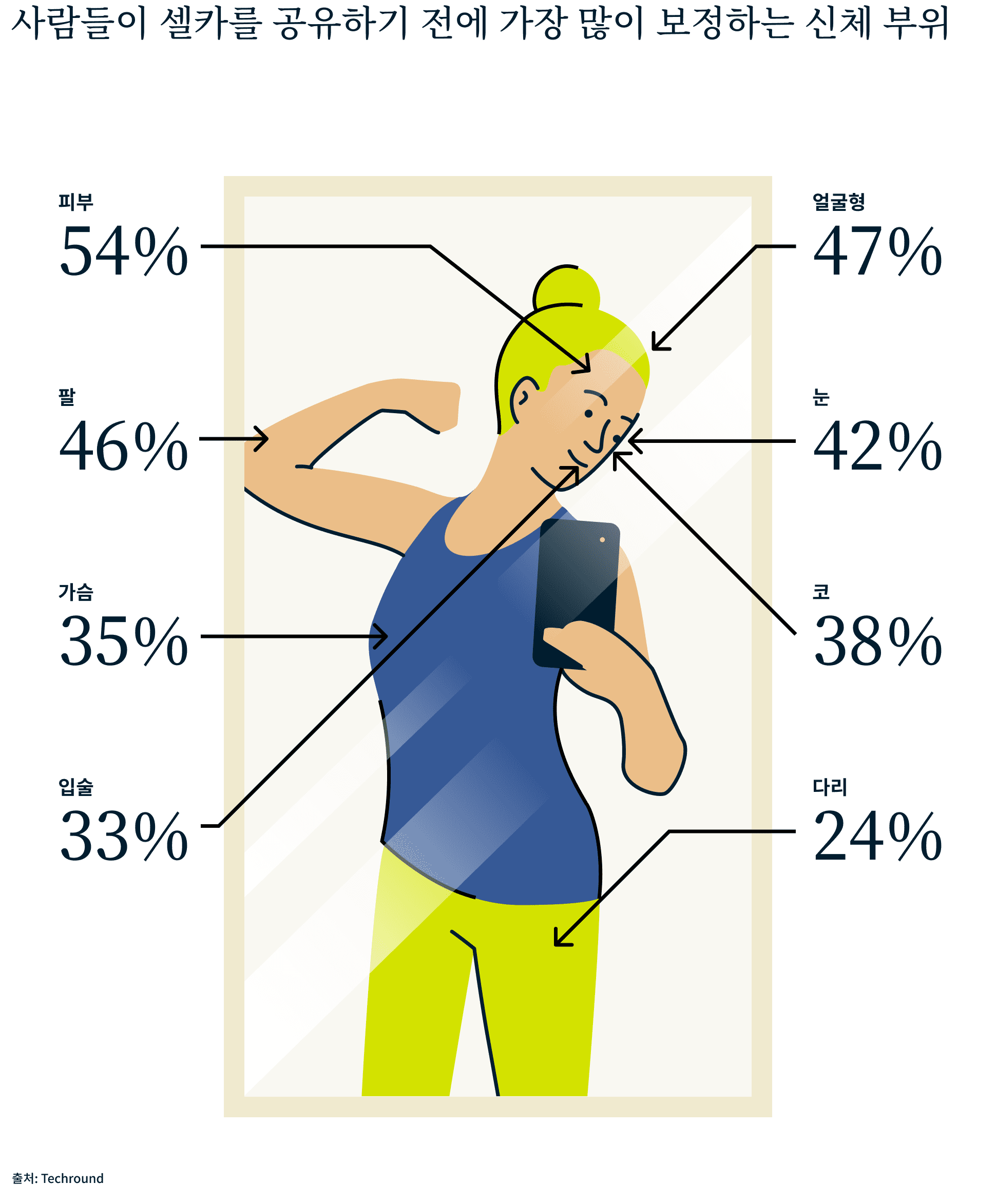 셀카를 보정하는 사람들 중 약 8%는 보정 도구로 인스타그램을 사용하며 3분의 2는 페이스튠 앱을 사용합니다. 이들은 보정을 통해 피부 결점을 숨기고 얼굴 특징이 바꿉니다.