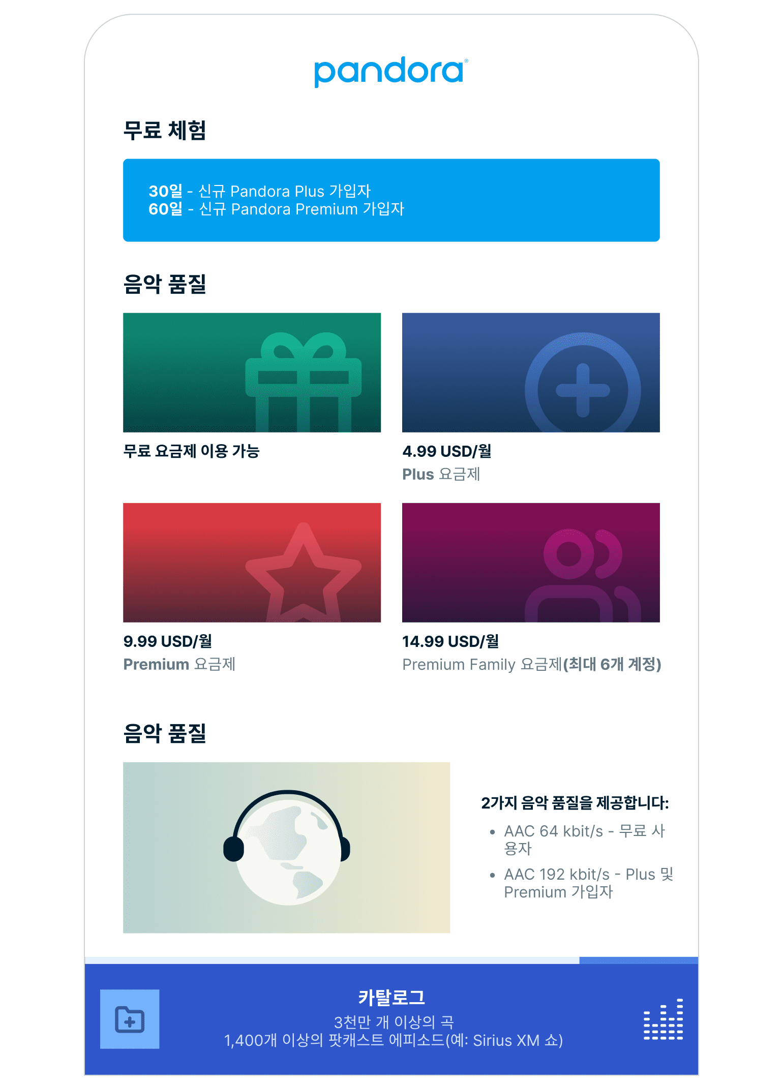 대부분 D: 어느 아티스트 또는 장르를 들을지 결정하기 어려운 당신에게는 Pandora가 딱입니다. Pandora의 Music Genome Project 알고리즘이 나에게 맞는 트랙을 고르는 데 도움을 줍니다.