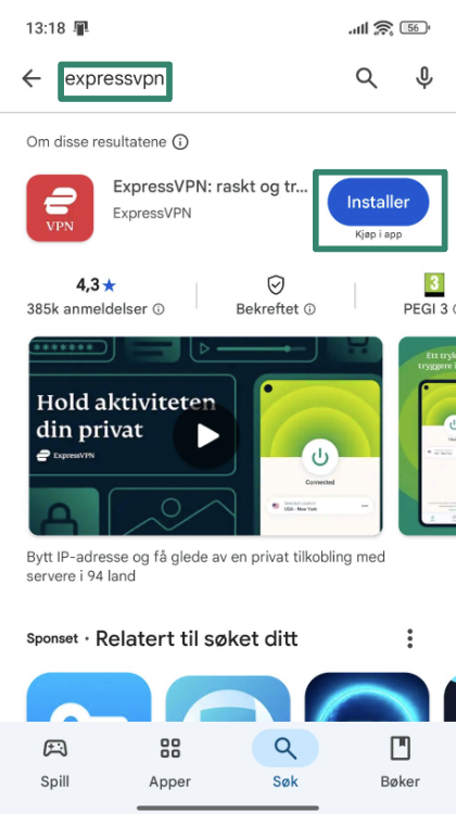 - Søk etter «ExpressVPN» og installer appen på enheten din.