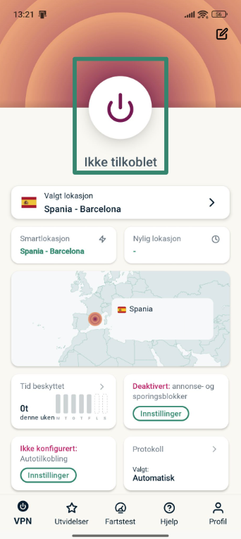 - Klikk på «Hurtigtilkobling» for å koble til og skjule IP-adressen din.