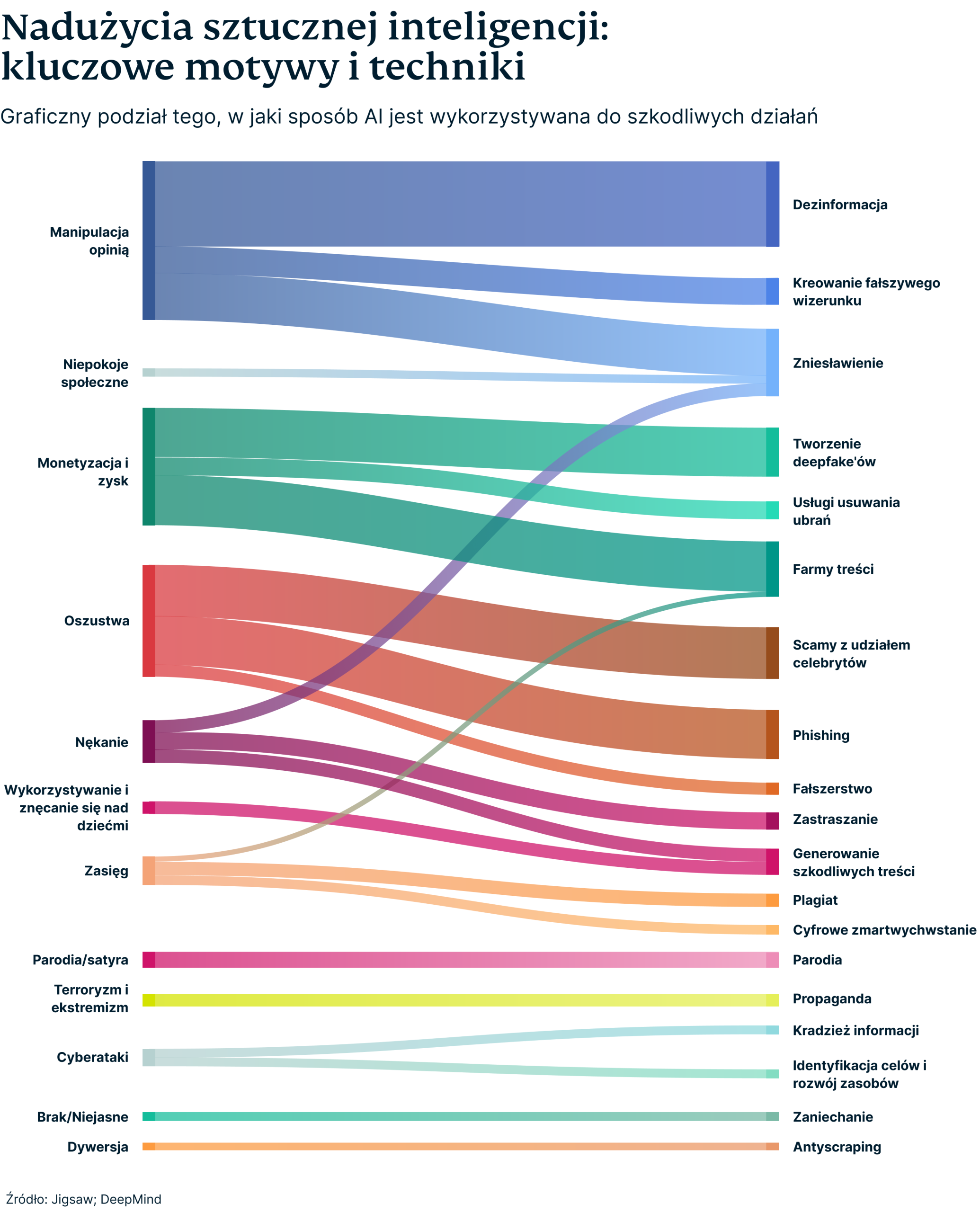 Niedawne badanie Google DeepMind wykazało, że wpływanie na opinię publiczną jest najczęstszym złośliwym celem korzystania z generatywnej sztucznej inteligencji – głównie właśnie poprzez deepfakes. Tworzenie realistycznych, ale fałszywych obrazów, filmów i dźwięków z udziałem osób fizycznych zdarza się prawie dwa razy częściej niż drugie z kolei najczęstsze niewłaściwe wykorzystanie narzędzi AI, czyli tworzenie dezinformacyjnych tekstów w Internecie.