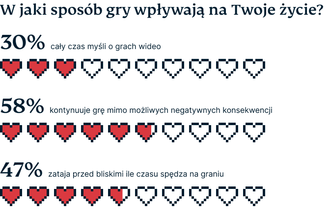 Brak możliwości znalezienia przyjemności poza światem gier może prowadzić do obsesji na punkcie gier wideo i zaniedbywania codziennych czynności, takich jak jedzenie, angażowanie się w interakcje społeczne, sen czy praca. Co niepokojące, ponad połowa ankietowanych wyznała, że często kontynuuje grę, mimo świadomości, że może ona negatywnie wpływać na ich życie codzienne.