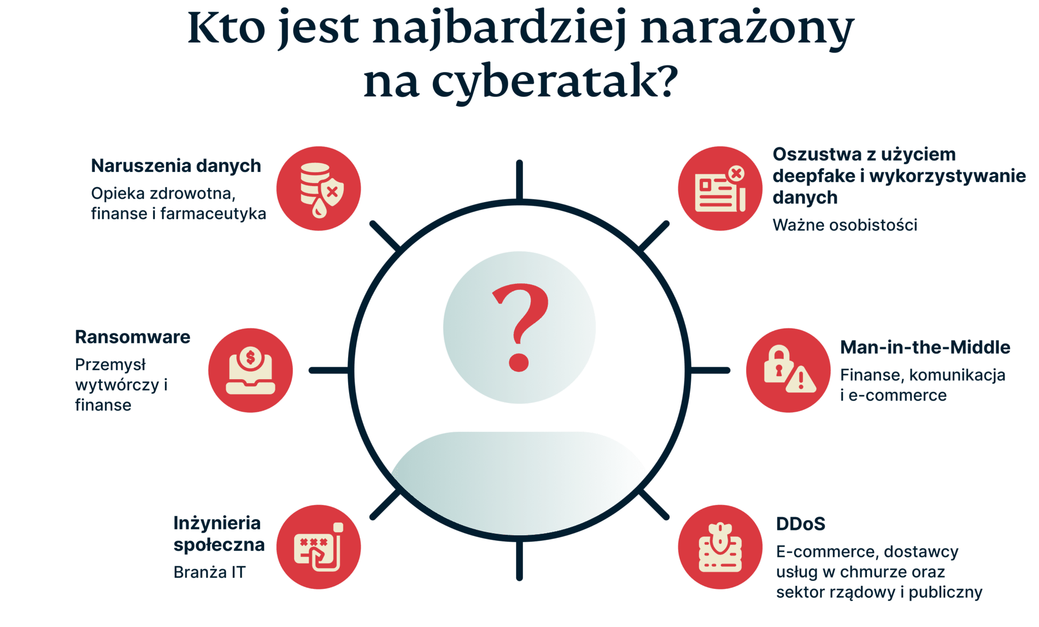 Cyberataki mogą być wymierzone w każdą osobę fizyczną lub firmę, ale niektóre sektory są bardziej podatne ze względu na charakter ich działalności i wrażliwość danych, którymi się zajmują. Szczególnie narażone są branże takie jak opieka zdrowotna, finanse i handel detaliczny, ponieważ są one integralną częścią codziennego życia.