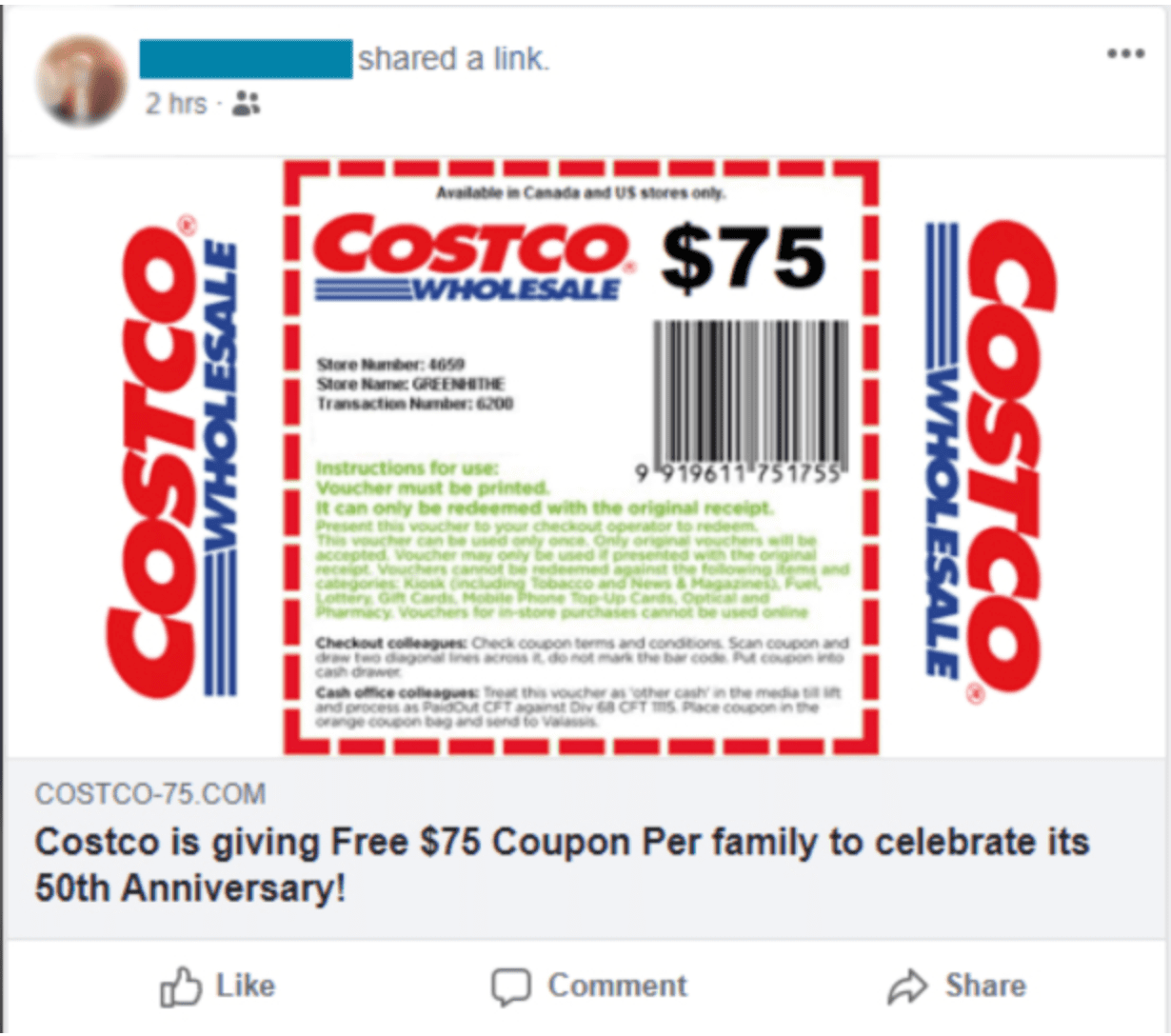 Um exemplo de golpe com cupons falsos no Facebook envolve golpistas promovendo um falso cupom da Costco para enganar os usuários; Crédito: Facebook