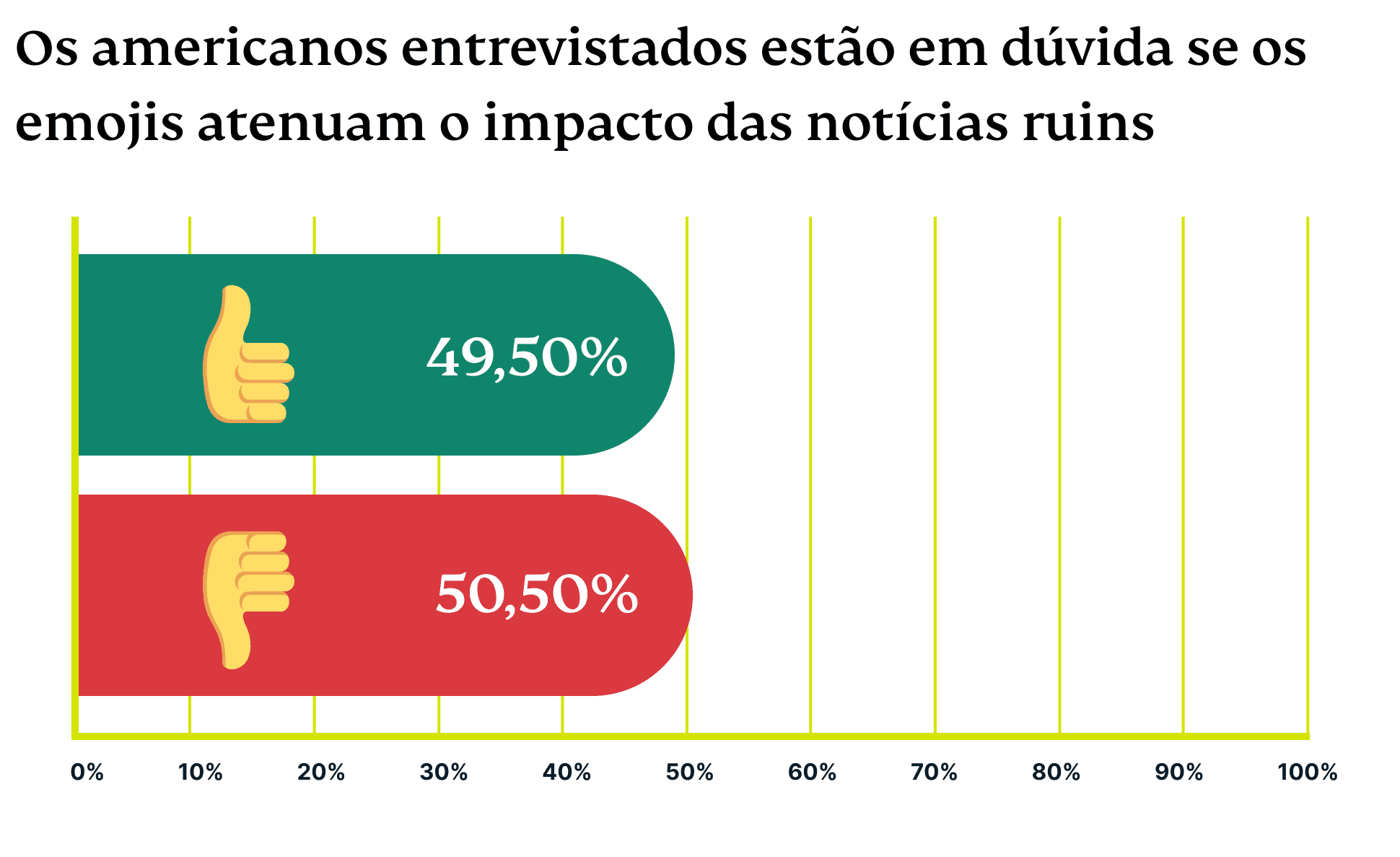 Mais da metade (51%) dos americanos disse que não acredita que os emojis atenuem o impacto das notícias ruins — um sentimento mais comum nos EUA do que na França, Alemanha ou Espanha. No entanto, mais da metade compartilha que também usou emojis para esconder como se sente.