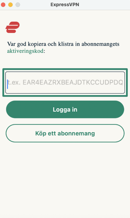 3. Ange din aktiveringskod för att logga in på ExpressVPN. Du hittar koden på ditt ExpressVPN-konto när du loggar in på webbportalen.