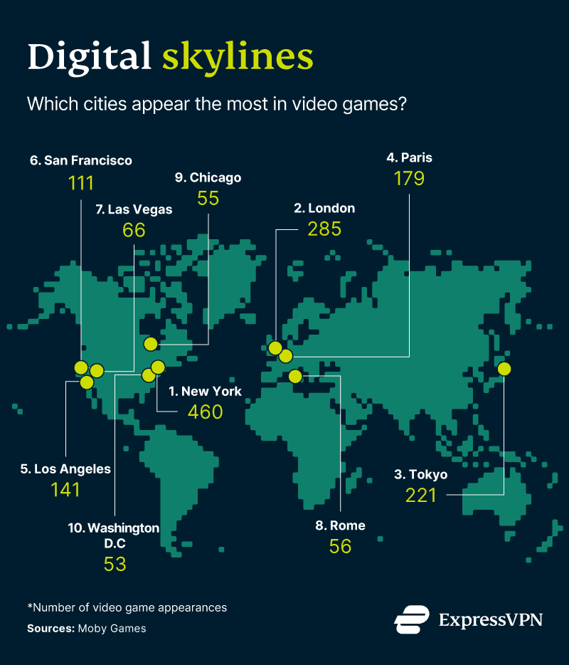 ExpressVPN's Gaming Destinations Report dives into the digital and real-world intersections that gamers love. We've analyzed 24 cities globally, chosen for their notable contributions to and associations with the gaming world.