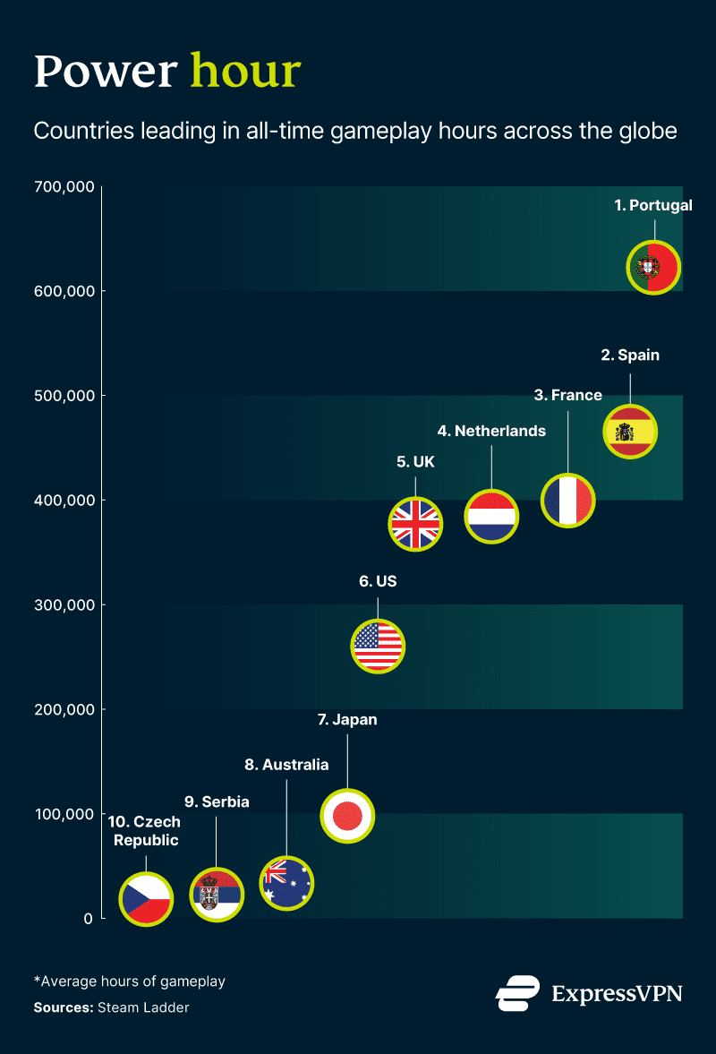 - Portugal, Spain, and France lead gameplay globally, with gamers dedicating hundreds of thousands of hours to gaming, indicating a deep engagement and passion for video gaming across these nations.