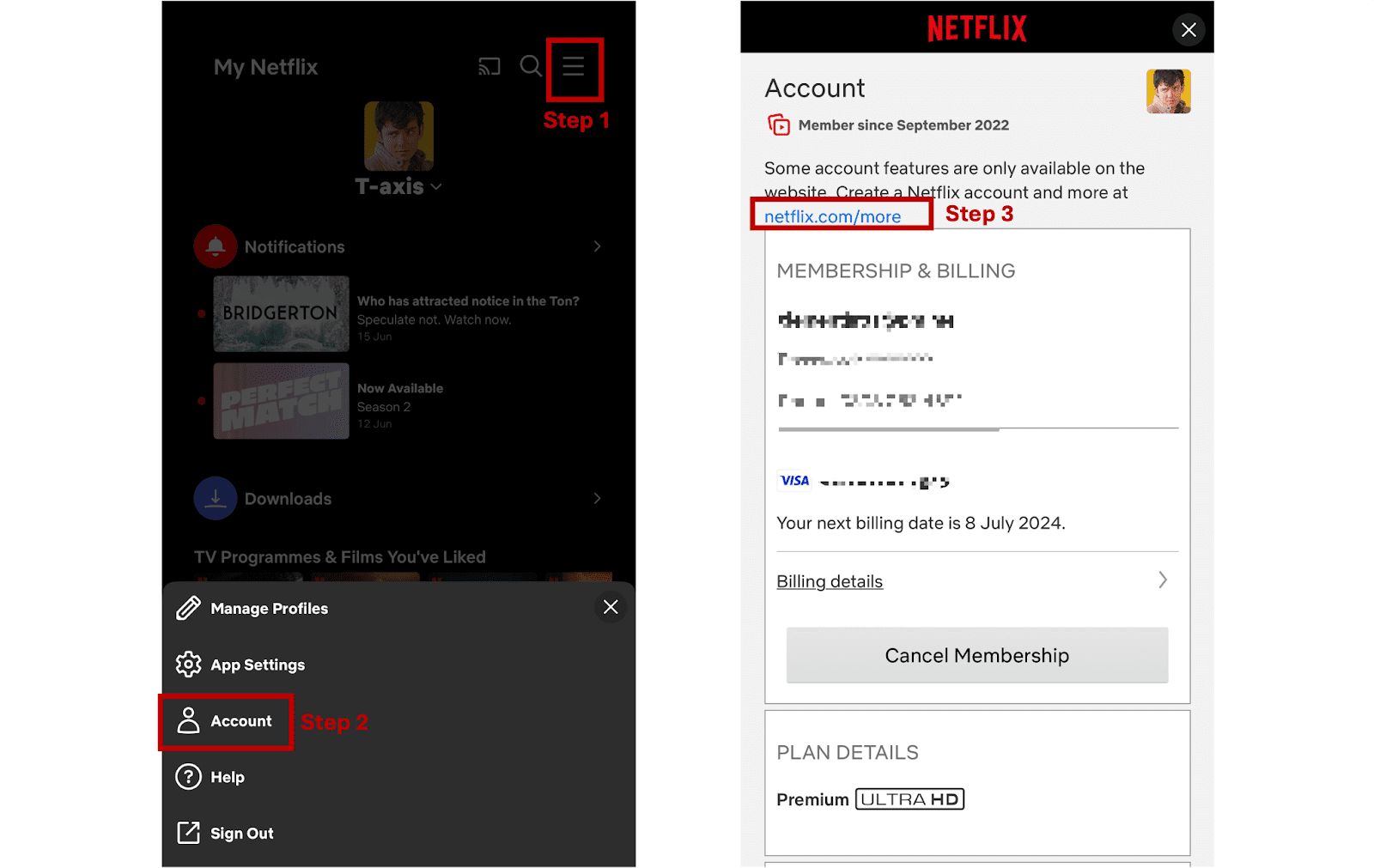 - Sign in to your account and tap the menu icon in the top-right corner. Select Account.