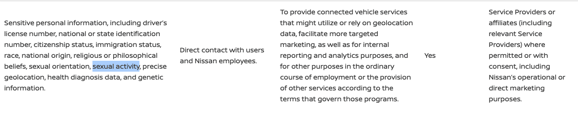 Nissan’s approach to privacy is deeply unsettling as it openly admits to collecting and sharing highly sensitive personal information, including details about sexual activity, health conditions, and genetic data—all for targeted marketing purposes. While the company’s transparency is notable, it underscores a troubling approach to handling user data.
