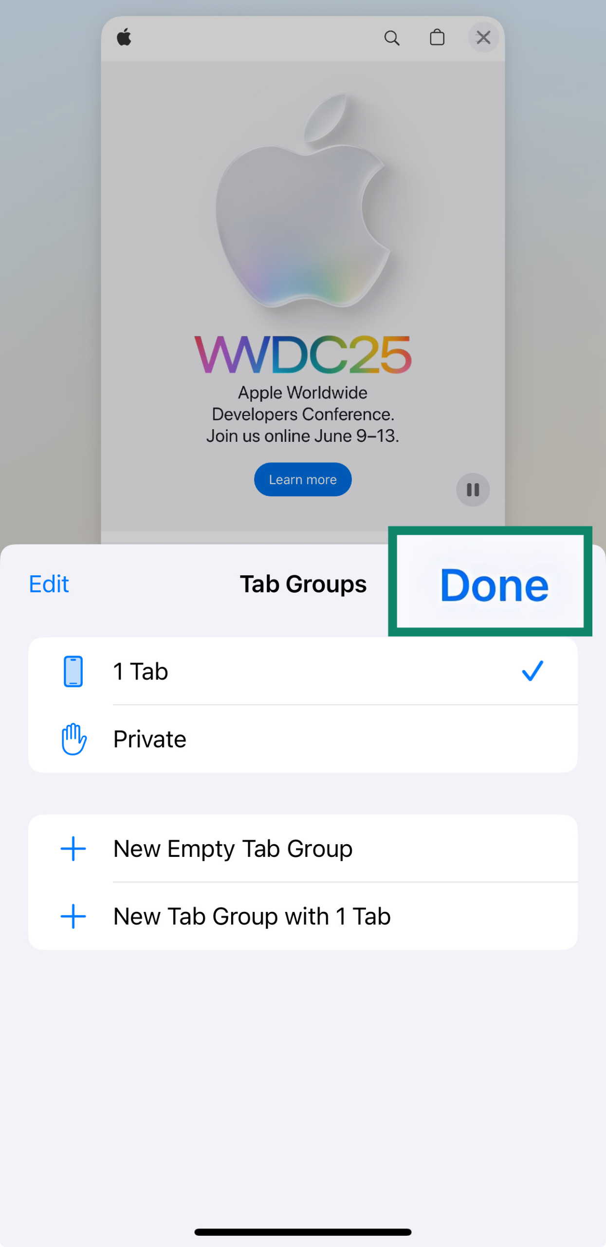 An iPhone opened to its Safari tabs, highlighting the Done option.
