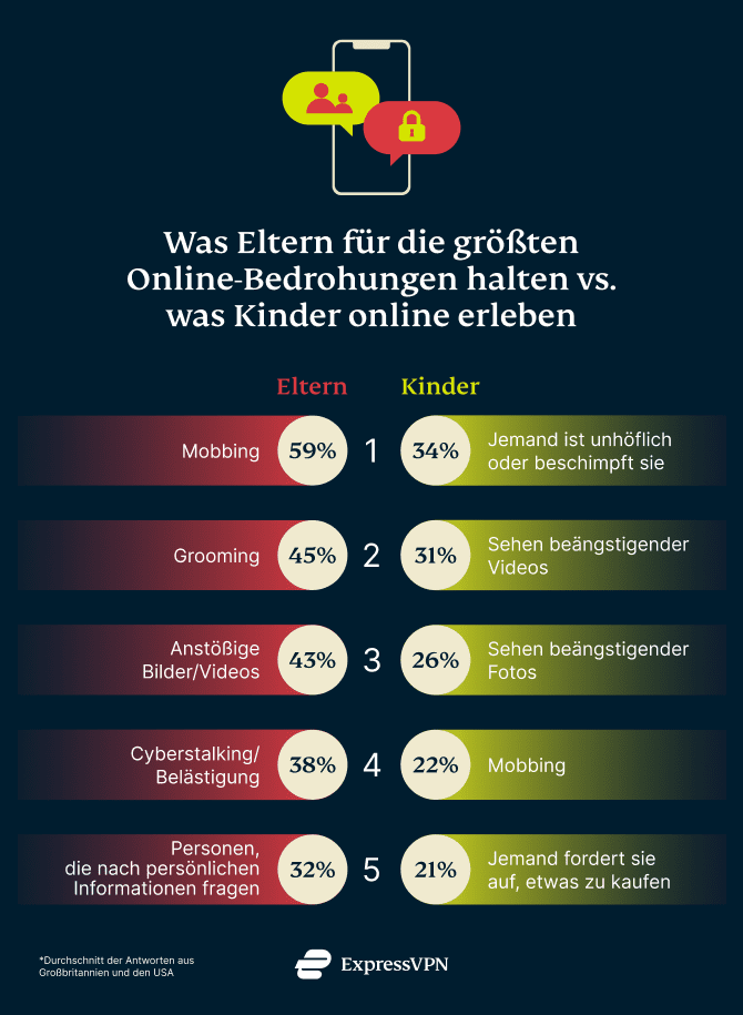 Als wir die Eltern fragten, was ihrer Meinung nach die größten Online-Bedrohungen sind, gaben 59 % der Befragten an, dass sie sich am meisten Sorgen machen, dass ihr Kind schikaniert wird. Danach folgten die Sorge, dass ihr Kind von einem Online-Sexualstraftäter beobachtet wird, die Befürchtung, dass ihr Kind online auf anstößige Inhalte stoßen könnte, und die Gefahr von Cyberstalking oder Belästigung durch andere Nutzer.