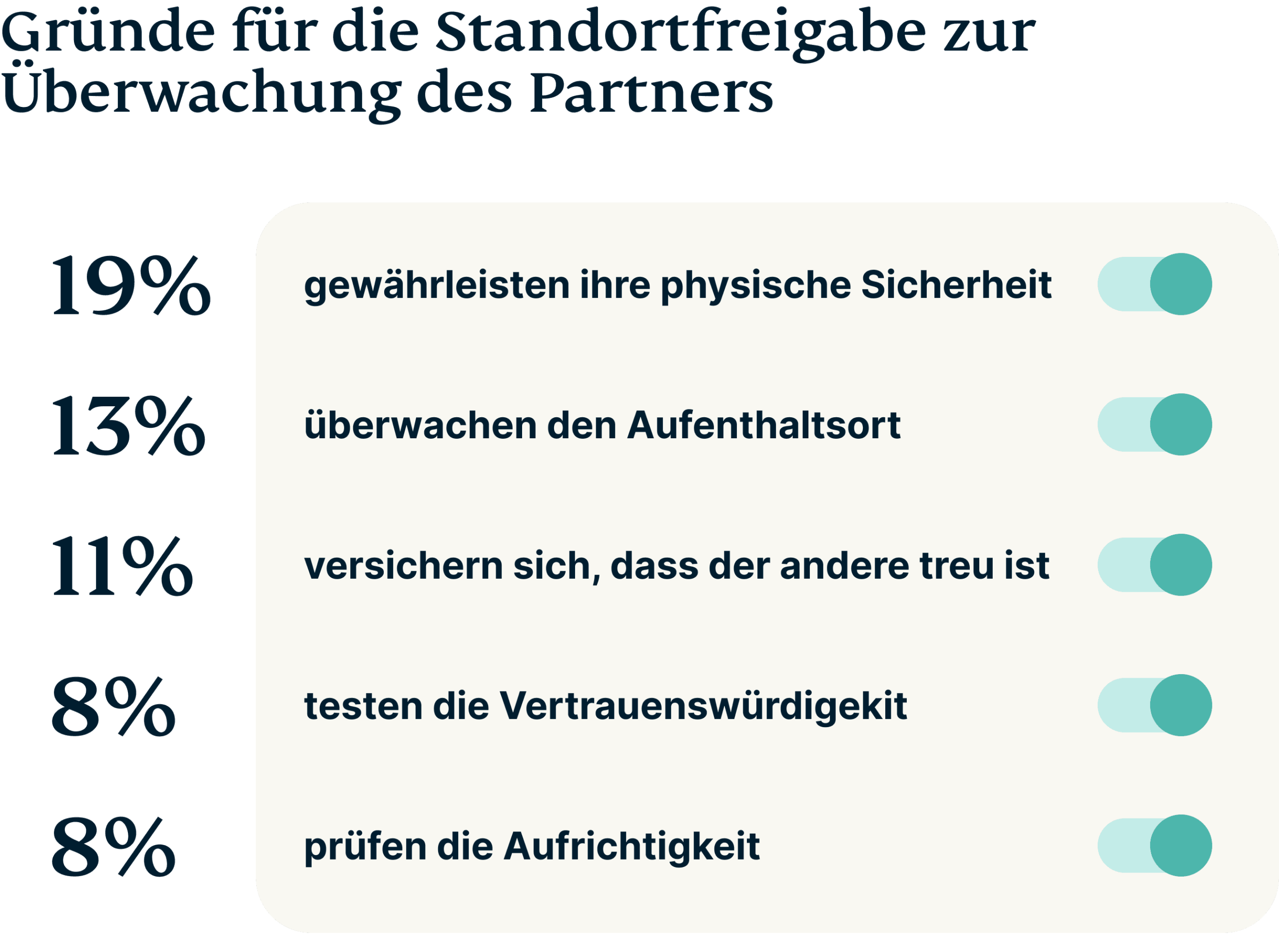 Fast die Hälfte unserer deutschen Teilnehmer (44 %) gibt zu, dass sie die Standortfreigabe nutzen, um ihren Partner zu tracken. Aber wofür nutzen sie sie eigentlich? Laut unserer Umfrage nutzen 19 % der Paare die Standortfreigabe, um die physische Sicherheit ihres Partners zu gewährleisten, 11 % prüfen damit, dass dieser treu ist und 13 % verwenden sie, um zu sehen, wo der andere ist.