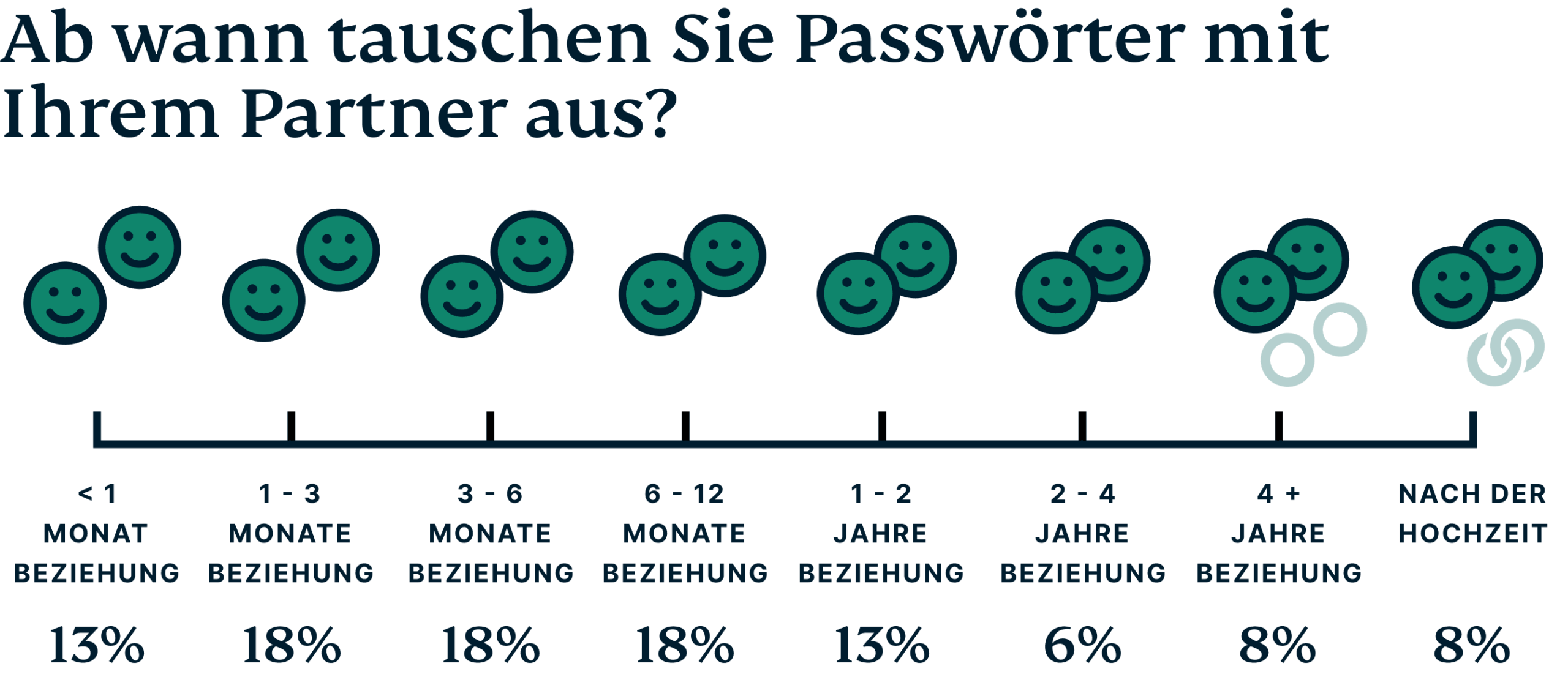 Jedes Paar entwickelt sich in seiner Beziehung unterschiedlich schnell und das gilt auch für den Austausch von Passwörtern. Während 8 % der Paare bis zur Heirat warten, bevor sie ihre Passwörter austauschen (im Vergleich zu 35 % der amerikanischen Paare), machen dies viele der Befragten schon viel früher: 12 % tauschen ihre Passwörter innerhalb des ersten Monats der Beziehung aus.