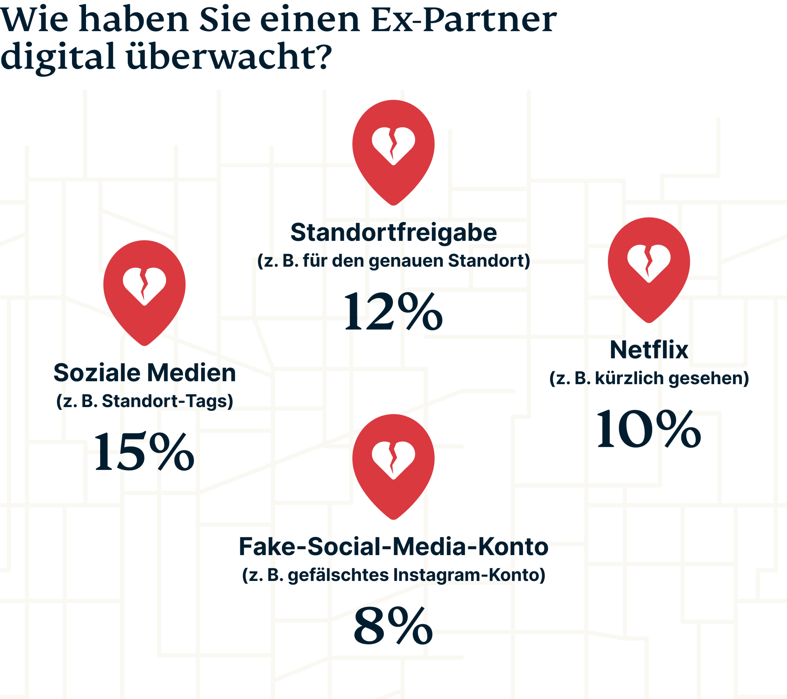 Ein für uns beunruhigendes Ergebnis ist, dass 36 % der deutschen Befragten zugeben, Technik zu nutzen, um ihren Ex digital zu verfolgen (zum Vergleich: 30% der befragten Amerikaner gaben dies ebenfalls zu).