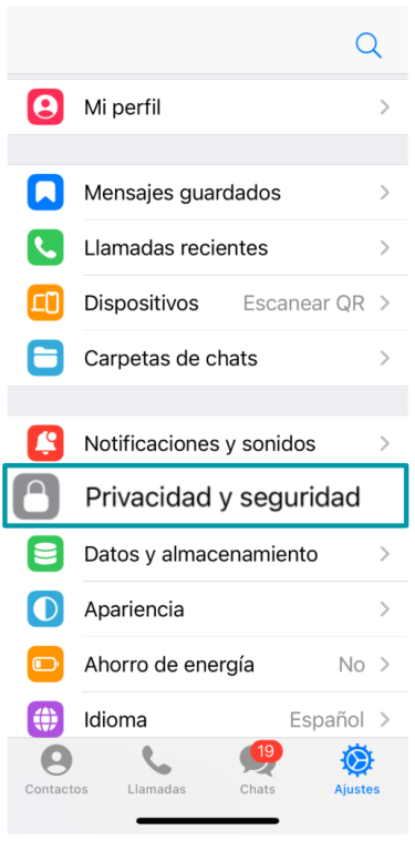 2. Pulsa en Privacidad y seguridad. Aquí puedes decidir quién puede ver tu número de teléfono, foto de perfil y estado. Puedes limitar el acceso a Mis contactos en lugar de a Todos para preservar la privacidad de tus datos personales.
