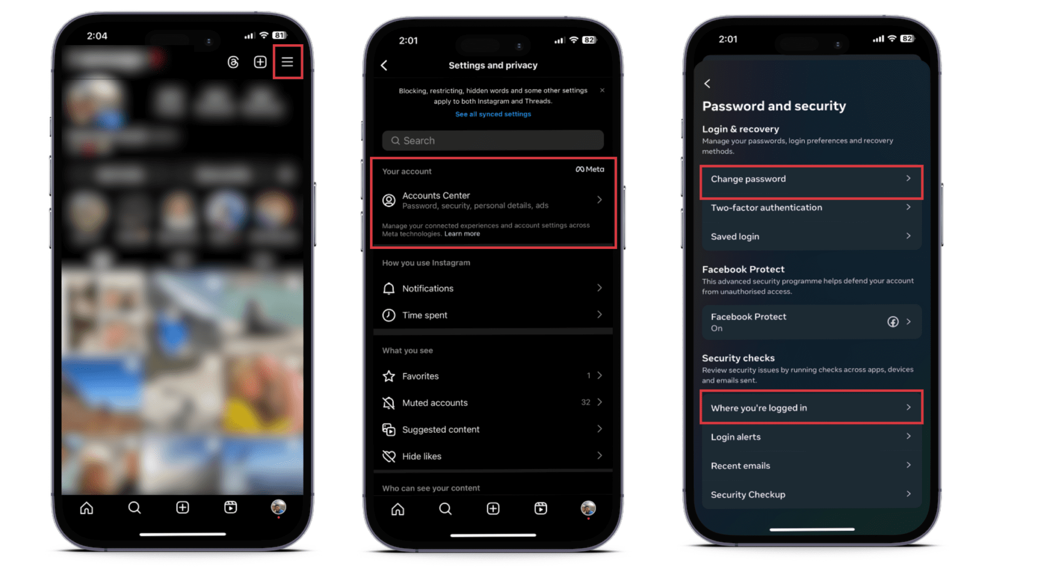Si puede iniciar sesión en su cuenta de Instagram, o si todavía tiene la sesión iniciada en Instagram en uno de sus dispositivos, cambie su contraseña de inmediato para sacar al intruso antes de que le cambie la información personal, borre sus fotos o postee quién sabe que cosas en su perfil.