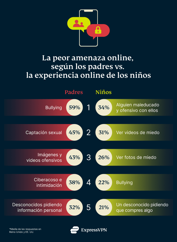 Cuando les preguntamos a los padres cuáles consideran que son las mayores amenazas online, el 59% de los encuestados dijeron que lo que más les preocupa es que sus hijos sean acosados. En siguiente lugar están las preocupaciones relacionadas con que sus hijos sean manipulados por un depredador online, los temores de que sus hijos puedan encontrar contenido ofensivo online, y los riesgos de ciberacoso o acoso por parte de otros usuarios.