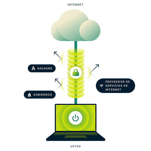 Cuando usted se conecta a internet con una VPN, la aplicación de VPN de su dispositivo (también llamada cliente VPN) establece una conexión con un servidor VPN seguro. Su tráfico pasa por su ISP, pero su ISP ya no puede leerlo ni ver su destino final. Las páginas web que usted visita ya no pueden ver su dirección IP original, solo la dirección IP del servidor VPN, que es compartida por muchos otros usuarios y cambia regularmente.