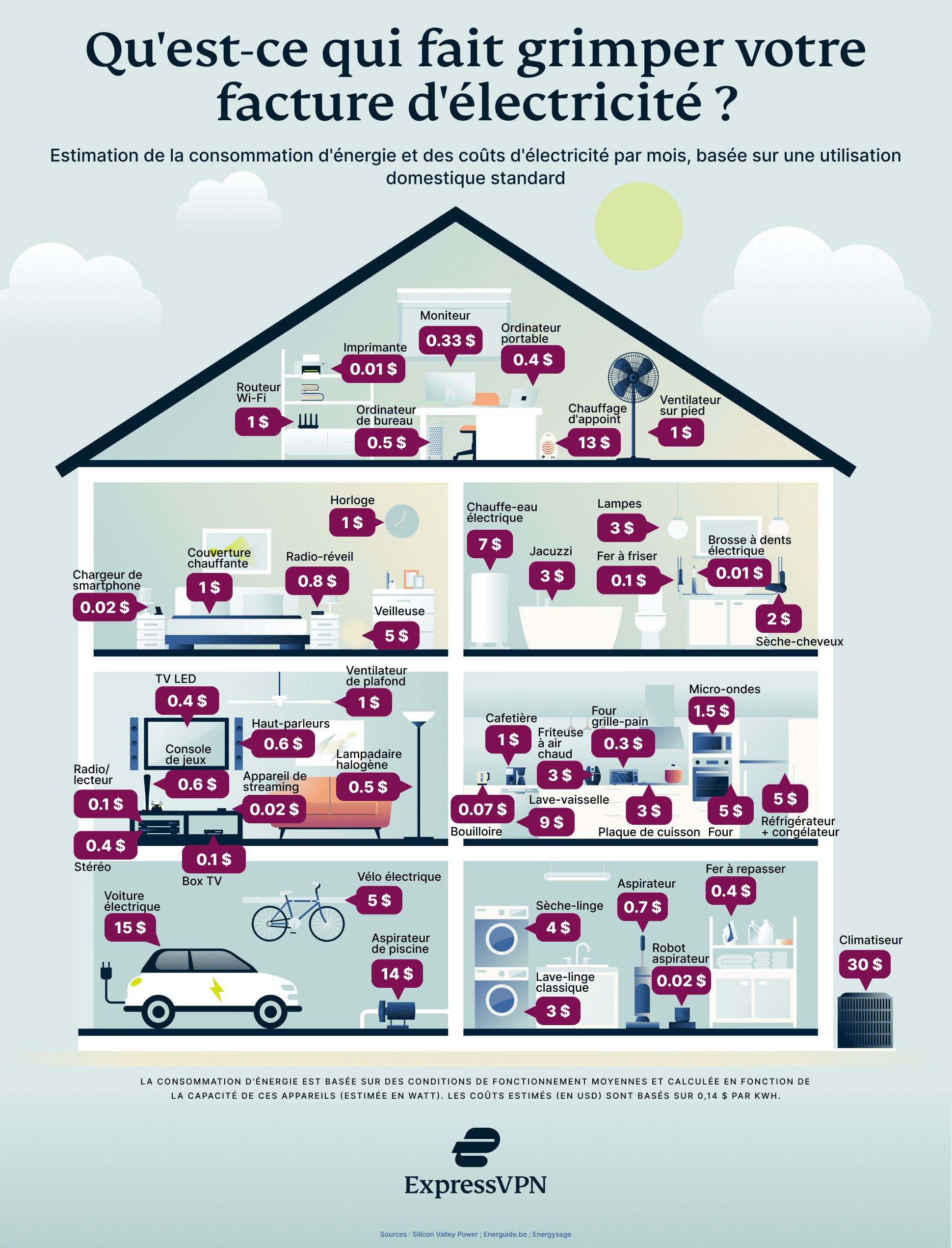 Même des appareils apparemment petits peuvent se révéler très coûteux au fil du temps. Par exemple, laisser une veilleuse allumée tous les soirs pendant un mois entier représente une consommation de 36 kWh (5 USD) d'électricité. De même, utiliser un chauffage d'appoint et un sèche-cheveux 20 minutes par jour pendant un mois vous fera consommer respectivement 90 kWh (13 USD) et 14 kWh (2 USD)