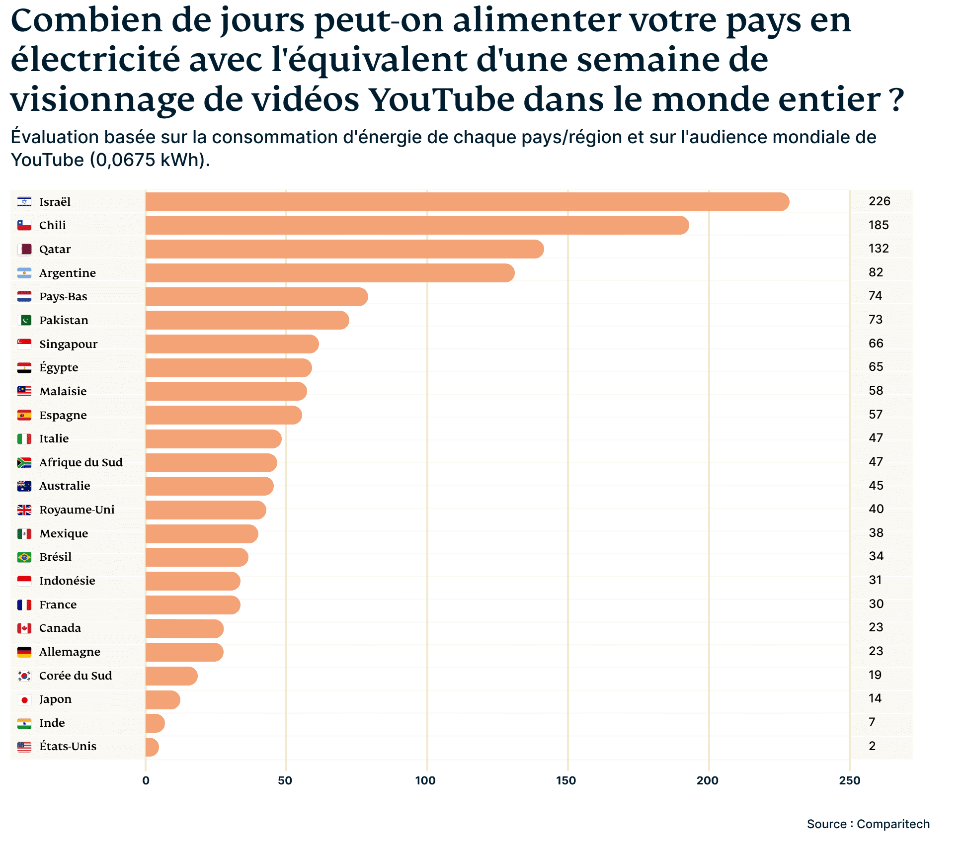 Regarder quelques vidéos sur YouTube semble anodin, mais à l'échelle mondiale, la quantité d'énergie consommée par les utilisateurs de YouTube en une semaine peut alimenter certains petits pays (comme l'Azerbaïdjan et l'Équateur) en électricité pendant un an. Voici un aperçu de la consommation annuelle d'énergie dans différents pays, correspondant à une semaine d'utilisation de YouTube dans le monde.