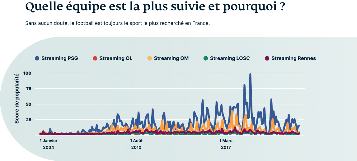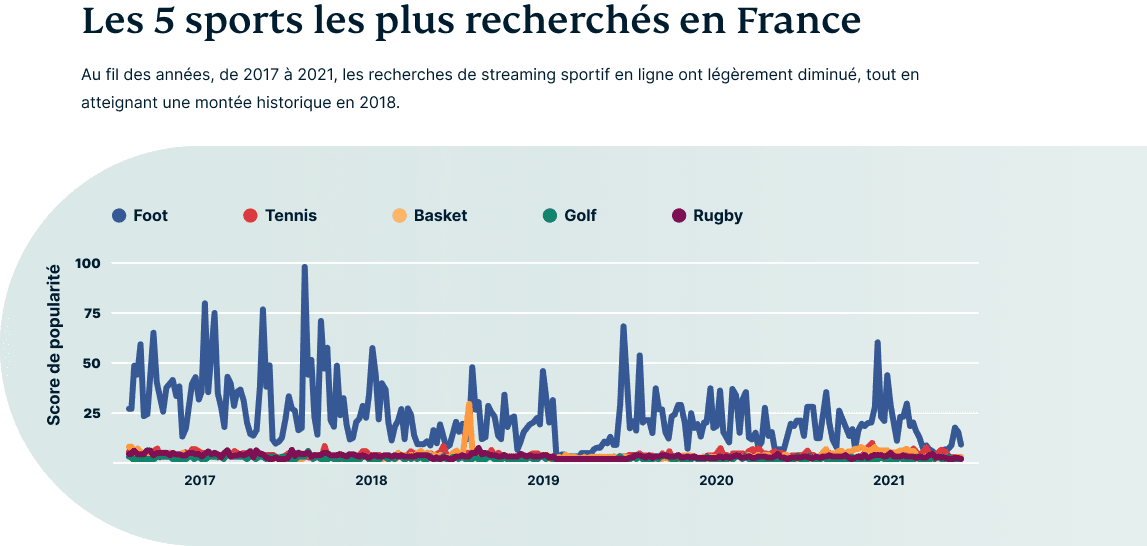 Le football est ainsi resté l'un des sports les plus recherchés en France, devant le tennis, le basket, le golf et le rugby. Notant l'ascension du PSG (Paris Saint-Germain) ainsi que d'excellents résultats de l'équipe de France, le football reste très populaire en matière de recherches. Le basket-ball a tendance à culminer lors des compétitions internationales, mais revient à son niveau d'intérêt habituel après ces compétitions. En regardant les 5 clubs de football les plus recherchés en Streaming en France, le PSG est en tête devant d'autres équipes telles que l'OL (Olympique Lyonnais), l'OM (Olympique Marseillais), le LOSC (Lille) et Rennes.