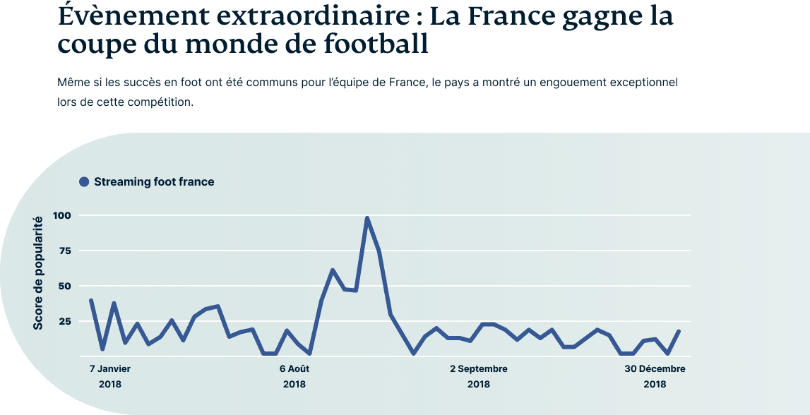 Néanmoins, il existe d'autres considérations, telles que la distance ou le niveau d'intérêt pour le sport, qui pourraient faire du streaming le choix le plus populaire. Dans cette section, nous nous efforcerons d'approfondir ces livres afin de découvrir quelques éléments intrigants. En revanche, comme on peut le voir dans le graphique suivant, le succès de l'équipe de France à la coupe du monde 2018 a généré un pic d'intérêt sans précédent.