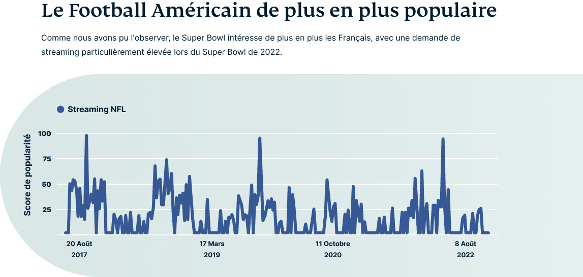 Comme le montre l'infographie, la NFL est quelque chose que les Français s'intéressent au streaming. Avec une énorme part de marché aux États-Unis, la NFL attire certainement l'attention au-delà des États-Unis.