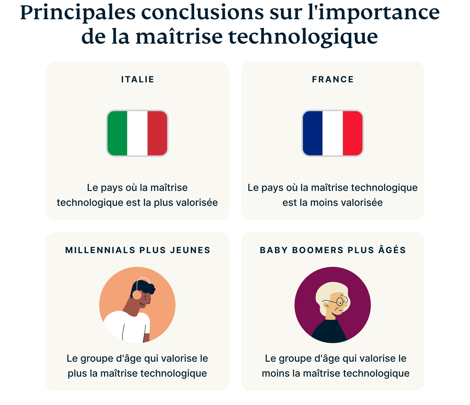 Au moment où nous atteignons la génération des jeunes baby-boomers (âgés de 59 à 68 ans), l’écart se creuse encore. Dans des pays comme la France et l’Espagne, les chiffres sont frappants : moins d’un tiers des répondants se sentent confiants dans leurs compétences technologiques. Même dans des pays comme les États-Unis et le Royaume-Uni, où la littératie numérique est généralement plus élevée, seuls environ la moitié des répondants de ce groupe d'âge se sentent à l'aise avec la technologie.