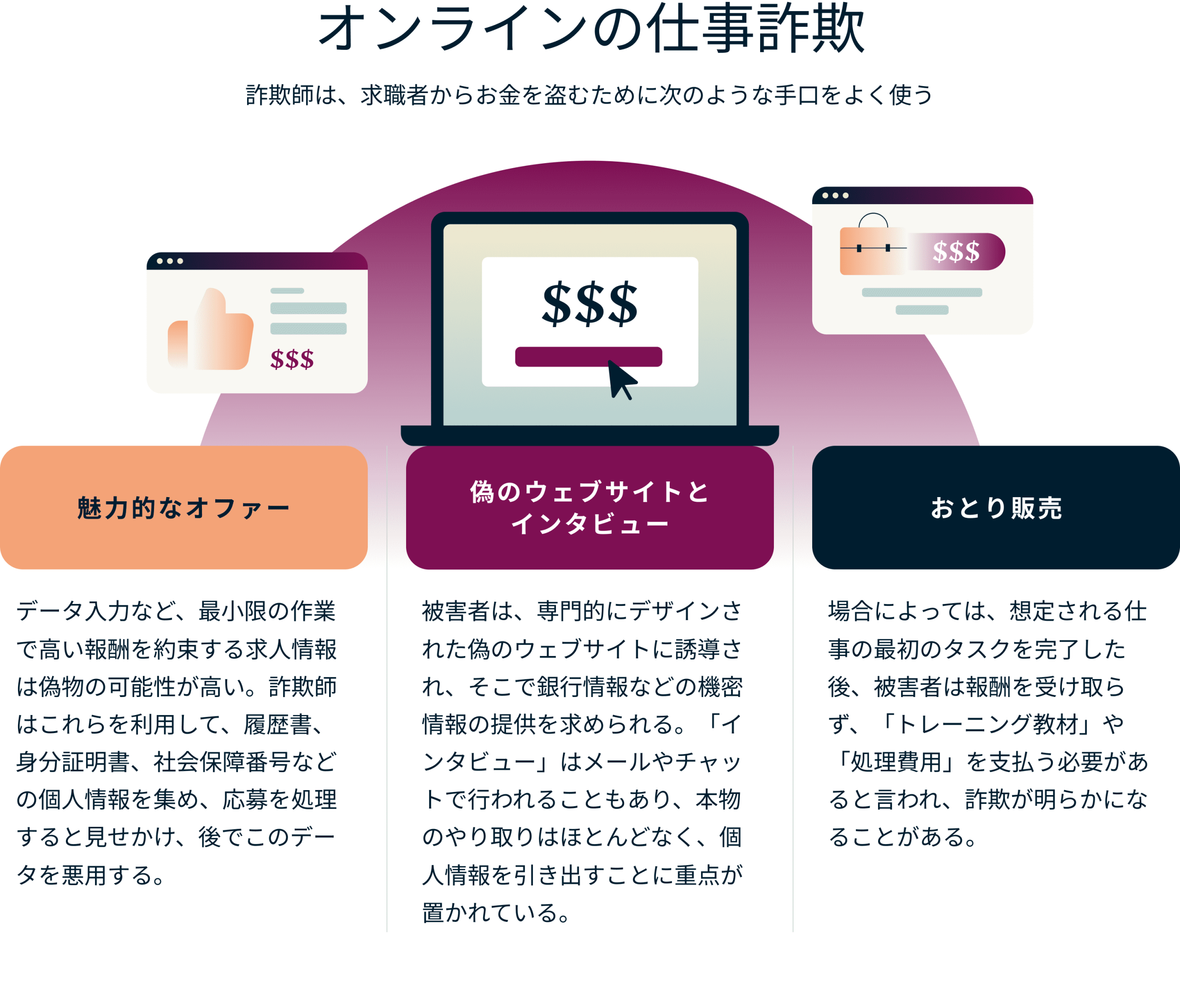 たとえば、パートタイムの仕事を探している新卒者のケースを考えてみましょう。彼女は、最小限の作業で魅力的な報酬が約束されたデータ入力の求人情報をネットで見つけました。経験不問で、応募手続きは異例の早さで済み、面接もありませんでした。期待に胸を躍らせた彼女は応募し、すぐに「採用」されました。しかし、その仕事は幻でした。履歴書や社会保障番号などの詳細情報を提供した後その会社は姿を消し、後に彼女の情報が個人情報の窃盗に使われたことが分かりました。