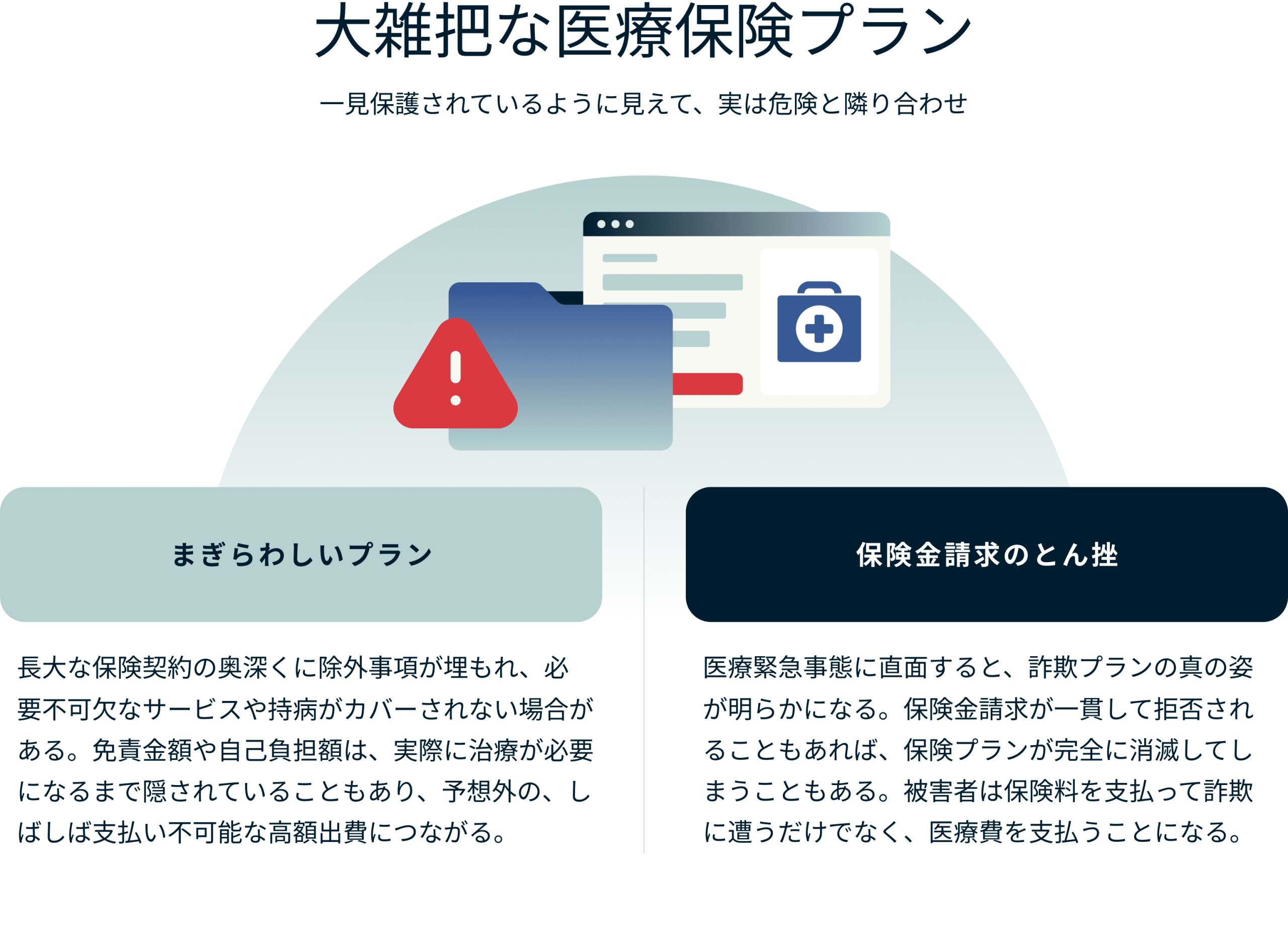 偽の医療保険は、その名の通り、安全であるかのような錯覚を与えるだけのものです。これらの保険は、底値で包括的な保障を約束するかもしれませんが、実際には多額の医療費と潜在的な法的トラブルに見舞われる可能性があります。