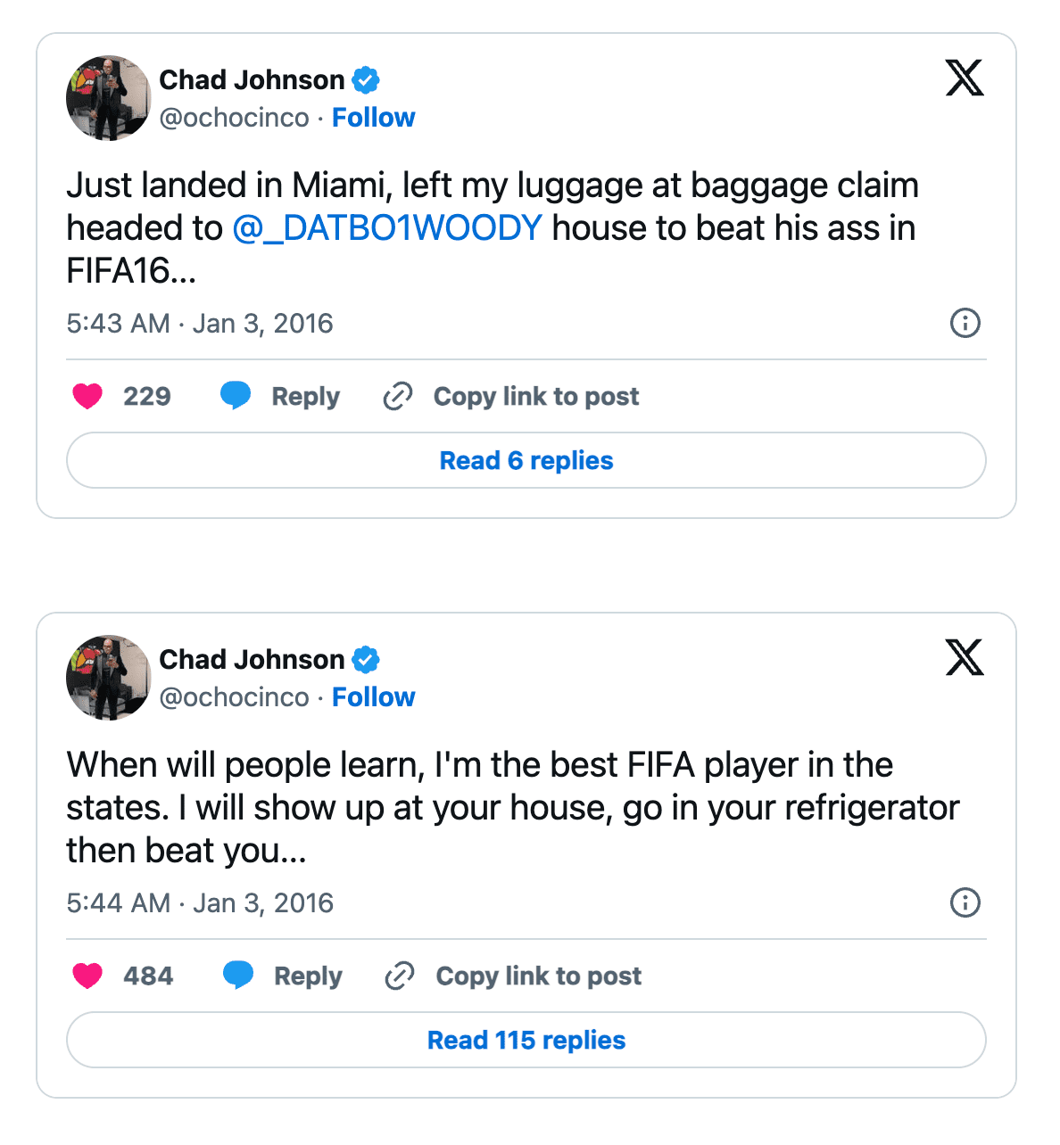 OchoCincoとしても知られるジョンソンは、有名な元NFL選手であるだけでなく、ゲームコミュニティでも注目されている人物です。サッカー選手としてのキャリアを終えた後、ジョンソンはその競争心をビデオゲームの領域に向け、特にMadden、Call of Duty、FIFAといったタイトルを得意としてきました。