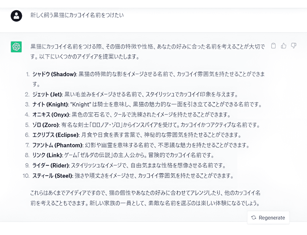 黒猫の特徴を捉えたカッコイイ名前を出してくれました。なぜか、全てカタカナでの返答ですね。ちなみに「ロロノア・ゾロ」は日本のアニメワンピースの登場人物です。