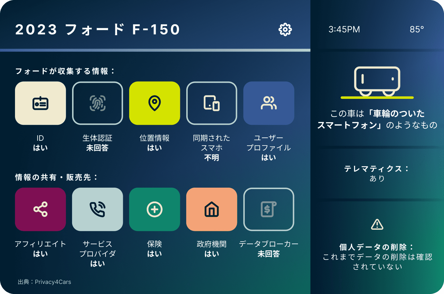 「現代の自動車は膨大な量のデータを収集し、車載やクラウドに無期限に保存しています。データは車だけでなく、その乗員も追跡します。位置情報履歴、電話内容(連絡先、メール、テキストメッセージ、ツイート、ソーシャルメディアのフィード)、音声記録、体重、その他の生体認証データが記録されます。異様に誇張して聞こえるかもしれませんが、実際にそうなのです。多くの場合、車のデータはドライバーではなく、メーカーの利益のために収集されます。