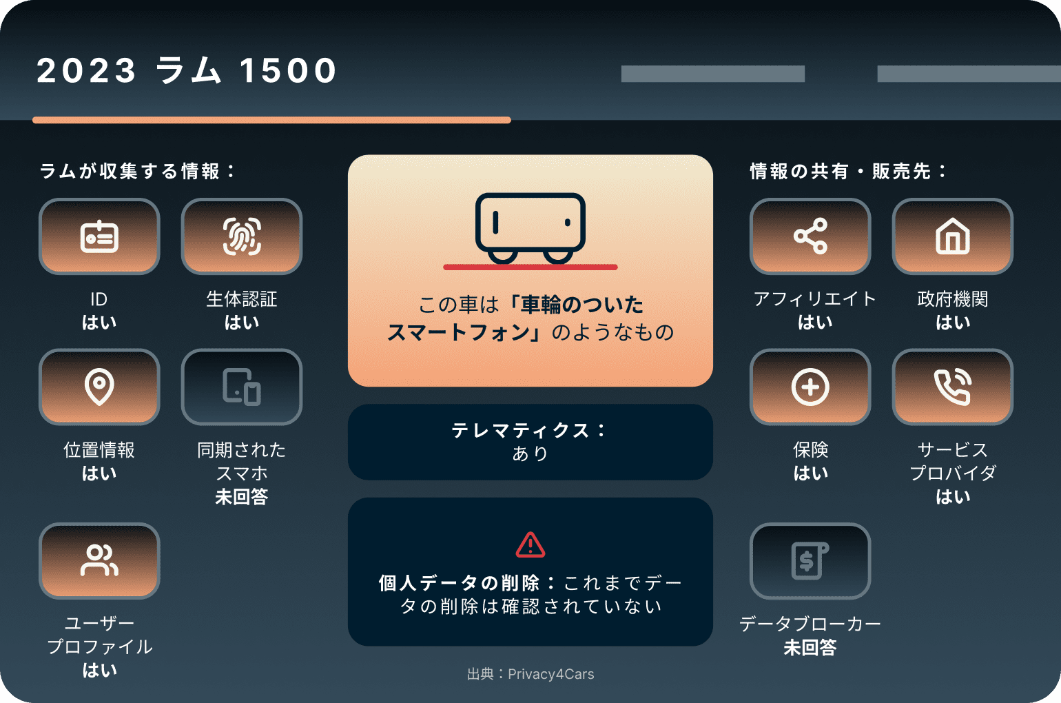 氏名、住所、社会保障番号、運転免許証の詳細、生体認証に至るまで、個人識別情報を含む個人データに関して、ラムは「削除しない」方針を採用しています。ラムは運転習慣も監視し、タイムスタンプ、速度、加速、ブレーキを記録します。車両は、位置情報、天候、走行ルートなどの移動の詳細を追跡します。さらに、給油、バッテリー残量、カメラ画像などを監視し、車両自身の状態も把握しています。