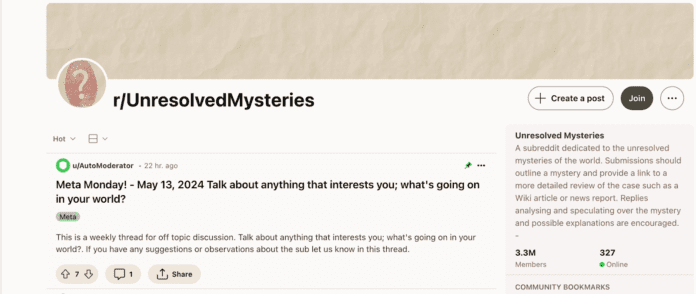 캡션: Reddit의 r/UnresolvedMysteries 같은 커뮤니티는 소셜 미디어 플랫폼이 어떻게 트루 크라임을 단독 활동에서 공동의 수사로 전환하는지를 보여줍니다. 330만 명이 넘는 회원을 보유한 이 서브 레딧은 해결되지 않은 미스터리를 분석하고 추측하는 데 전념합니다.