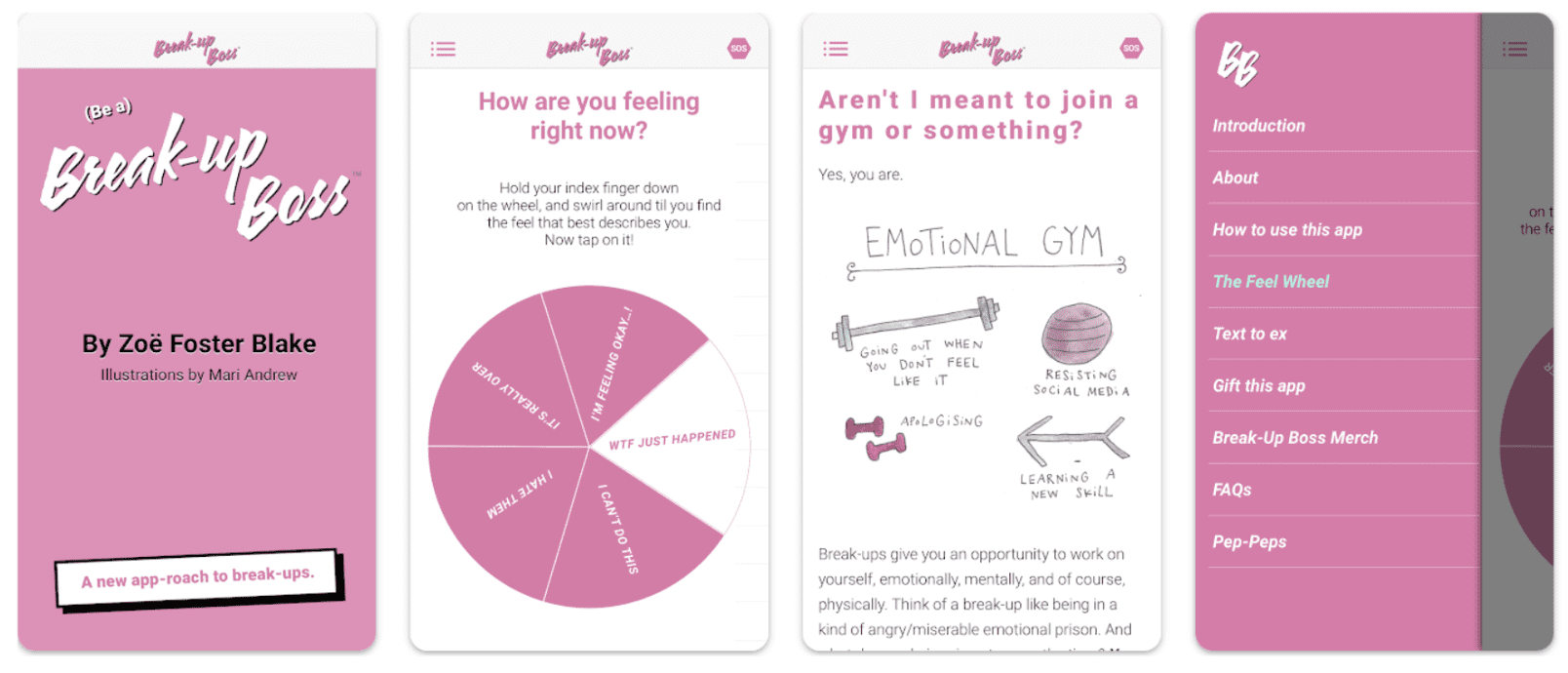 Break-Up Boss levert door middel van zijn SOS-citaten dagelijks een hapklare dosis positiviteit, kracht en frisse perspectieven. Het heeft ook een “Feel Wheel” voor realtime advies op maat. Het stelt gebruikers in staat om gedragsexperimenten te doen (zoals wat je tegen je ex zou zeggen zonder rechtstreeks met hem of haar te hoeven praten), waardoor ze de situatie kunnen verwerken en minder emotionele onrust hoeven te ervaren.