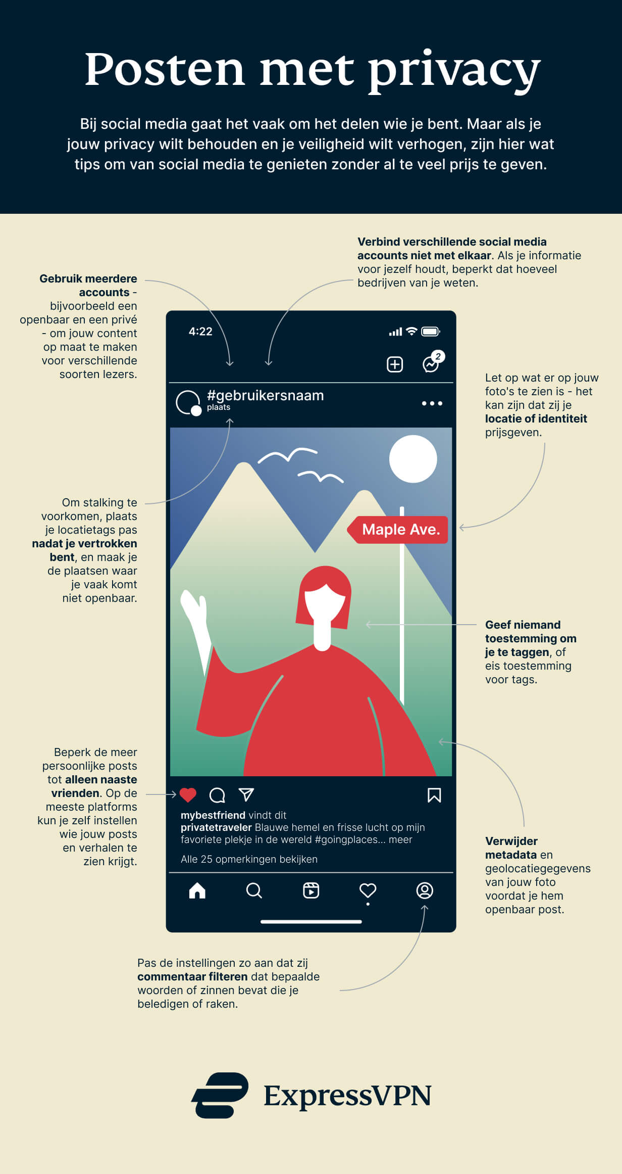 Weliswaar hoort de verantwoordelijkheid om beschermd te zijn niet te liggen bij de slachtoffers van stalking en cyberpesten, maar er zijn manieren om jezelf te beschermen. Voor de Stop Cyberpesten Dag, die valt op 17 juni 2022, hebben wij een infografiek samengesteld met praktische tips over privé en veilig blijven op social media.