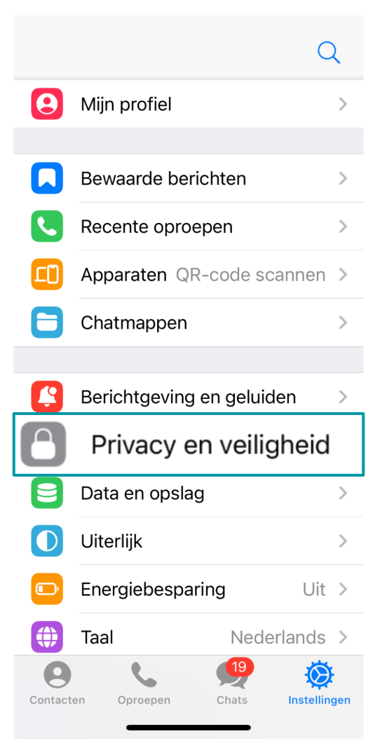 - Tik op Privacy en Beveiliging. Hier kun je bepalen wie je telefoonnummer, profielfoto en laatst gezien-status kan zien. Door de toegang te beperken tot 'Mijn contacten' in plaats van 'Iedereen', kun je je persoonlijke gegevens privé houden.