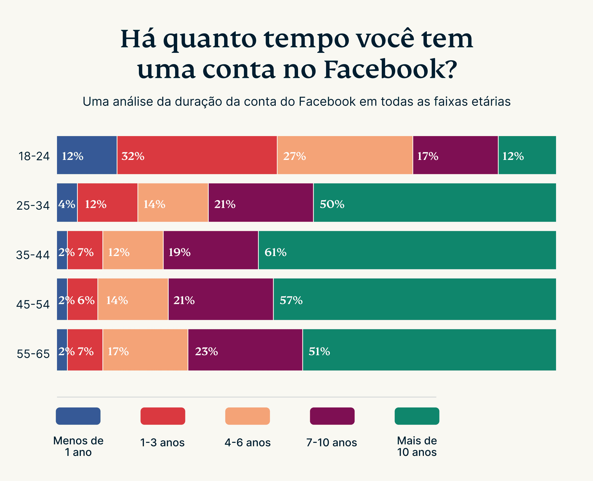 Os usuários de 35 a 44 anos são os mais leais ao Facebook, com 72% ainda ativos e 61% usando a plataforma há mais de uma década.