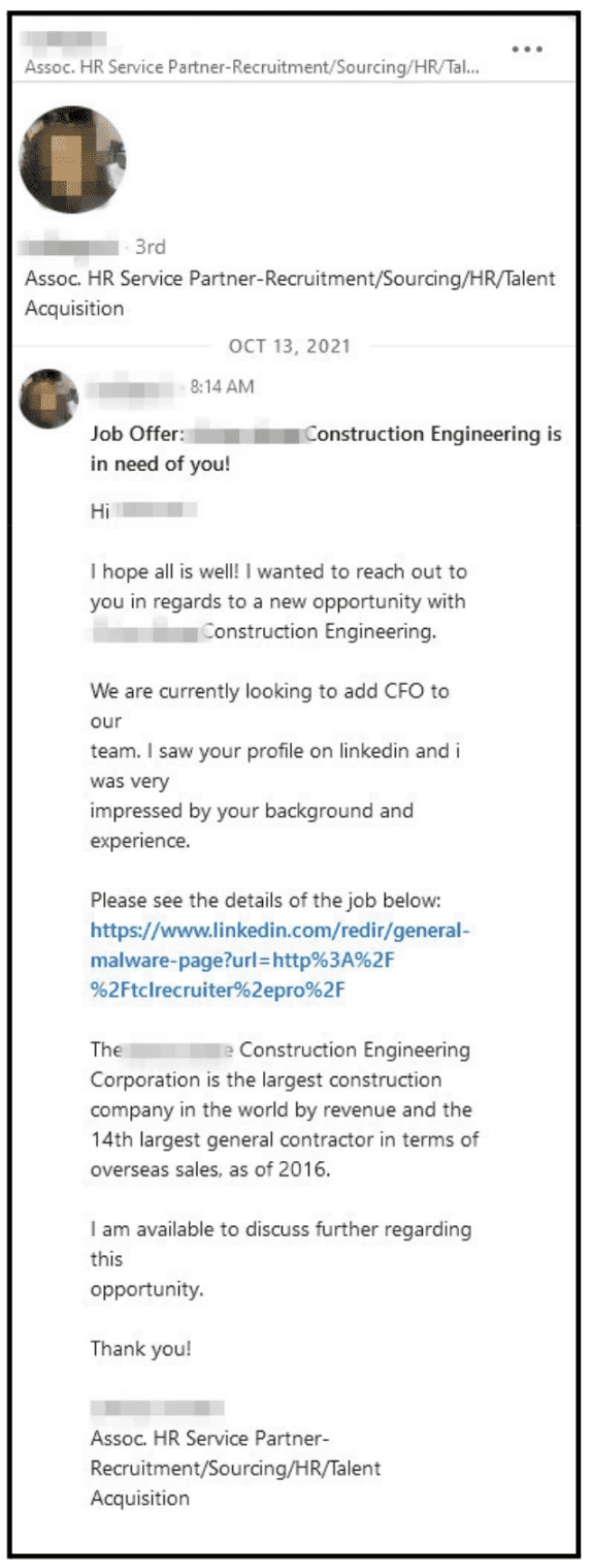 Alerta de fraude no LinkedIn: uma oferta de emprego falsa de uma empresa real, incluindo um link suspeito que contém a palavra “malware”.