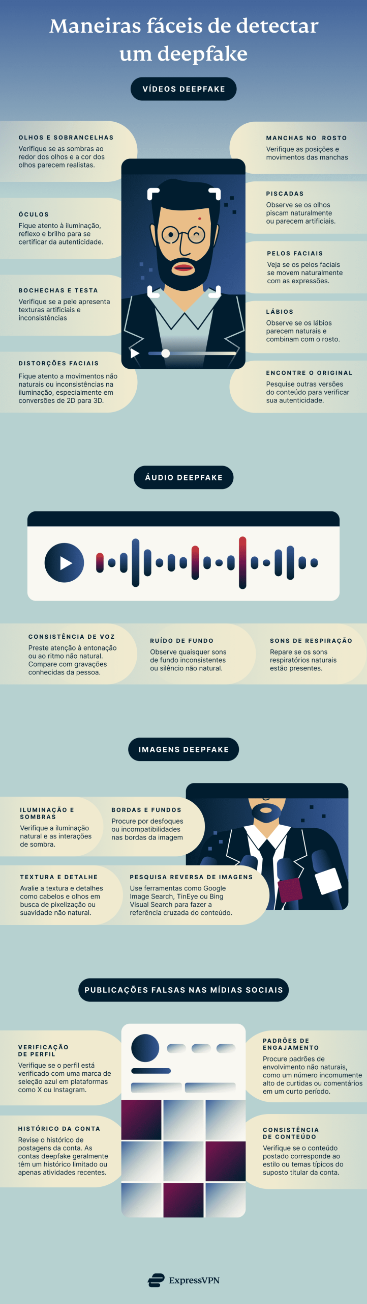 - A ExpressVPN, provedora líder de serviços VPN, oferece um guia para ajudar os usuários a identificar os sinais reveladores de deepfakes e notícias eleitorais falsas.