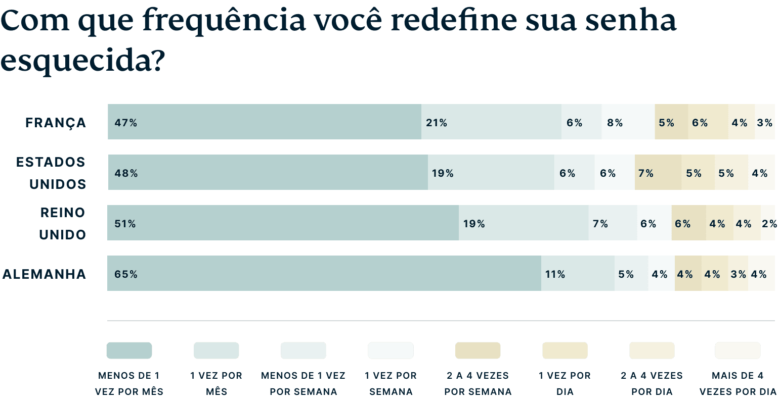 Quando questionados sobre a frequência, descobrimos que 52% dos entrevistados dos EUA redefiniram suas senhas pelo menos uma vez por mês, com números semelhantes na França (53%) e no Reino Unido (50%). Mas os alemães parecem esquecer suas senhas com menos frequência e apenas 35% precisam redefini-las pelo menos uma vez por mês.