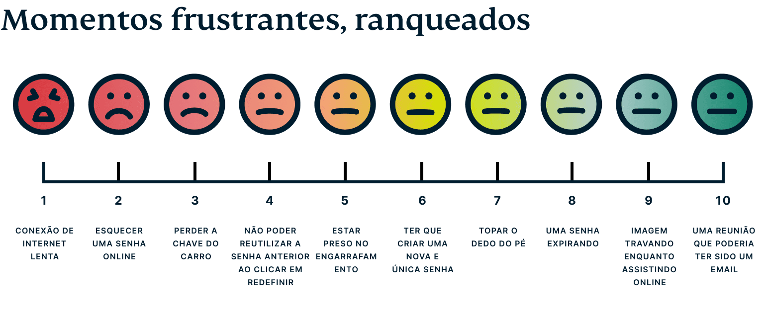 A maioria dos entrevistados (35%) cita que somente uma conexão de Internet lenta é mais irritante do que esquecer uma senha online. Essa frustração é seguida pela redefinição de uma senha e ser informado que ela não pode ser a mesma que a antiga (25%).
